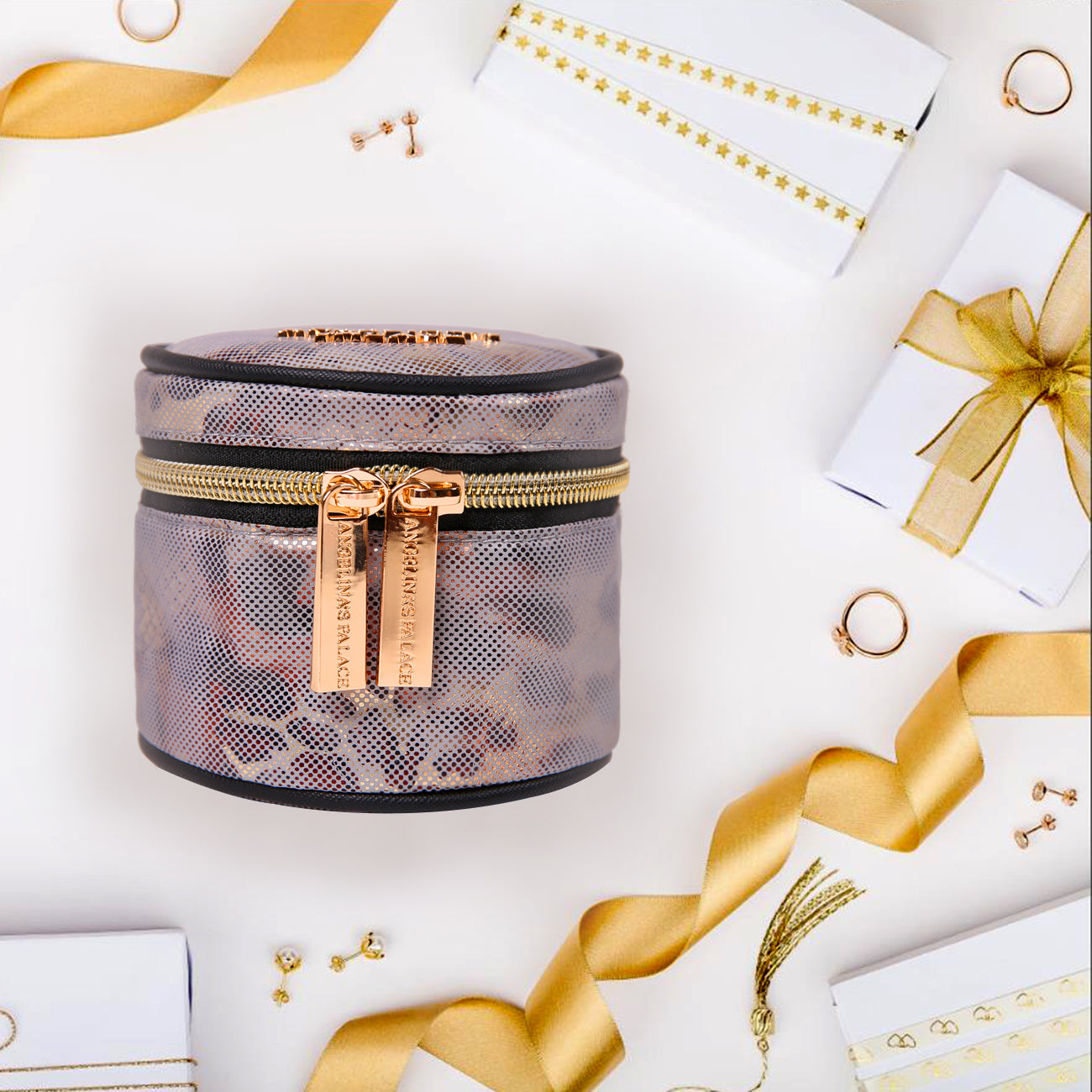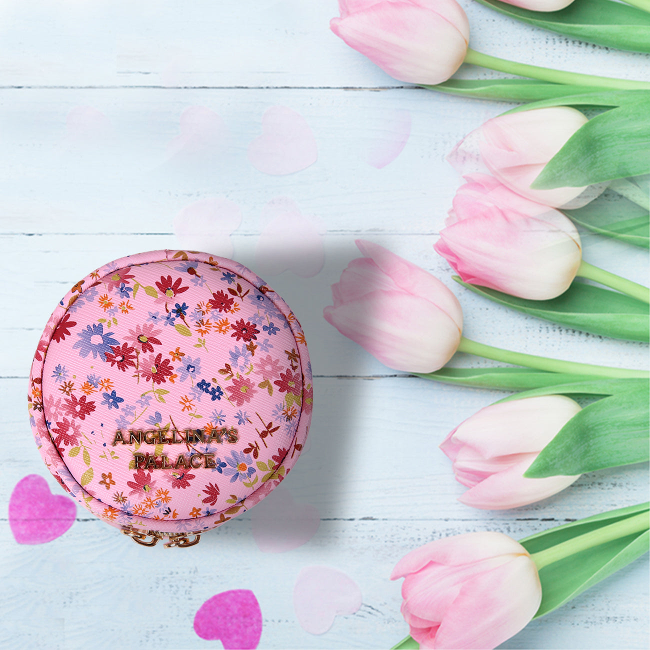Delicately crafted with a durable yet soft exterior, adorned in a charming blossom pink hue, this travel jewelry case adds a touch of whimsy to your travels. Its round silhouette exudes a sense of playful sophistication, while the compact size ensures it easily fits into your handbag or carry-on luggage.