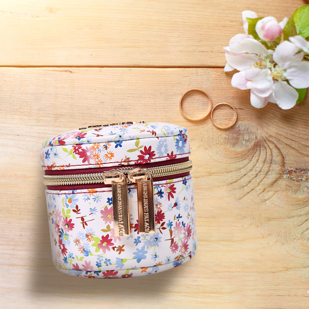 Introducing our compact yet charming travel round jewelry case in the enchanting Blossom Wine color. Perfectly sized for your adventures, this elegant case provides a stylish solution for safeguarding your precious jewels on the go.