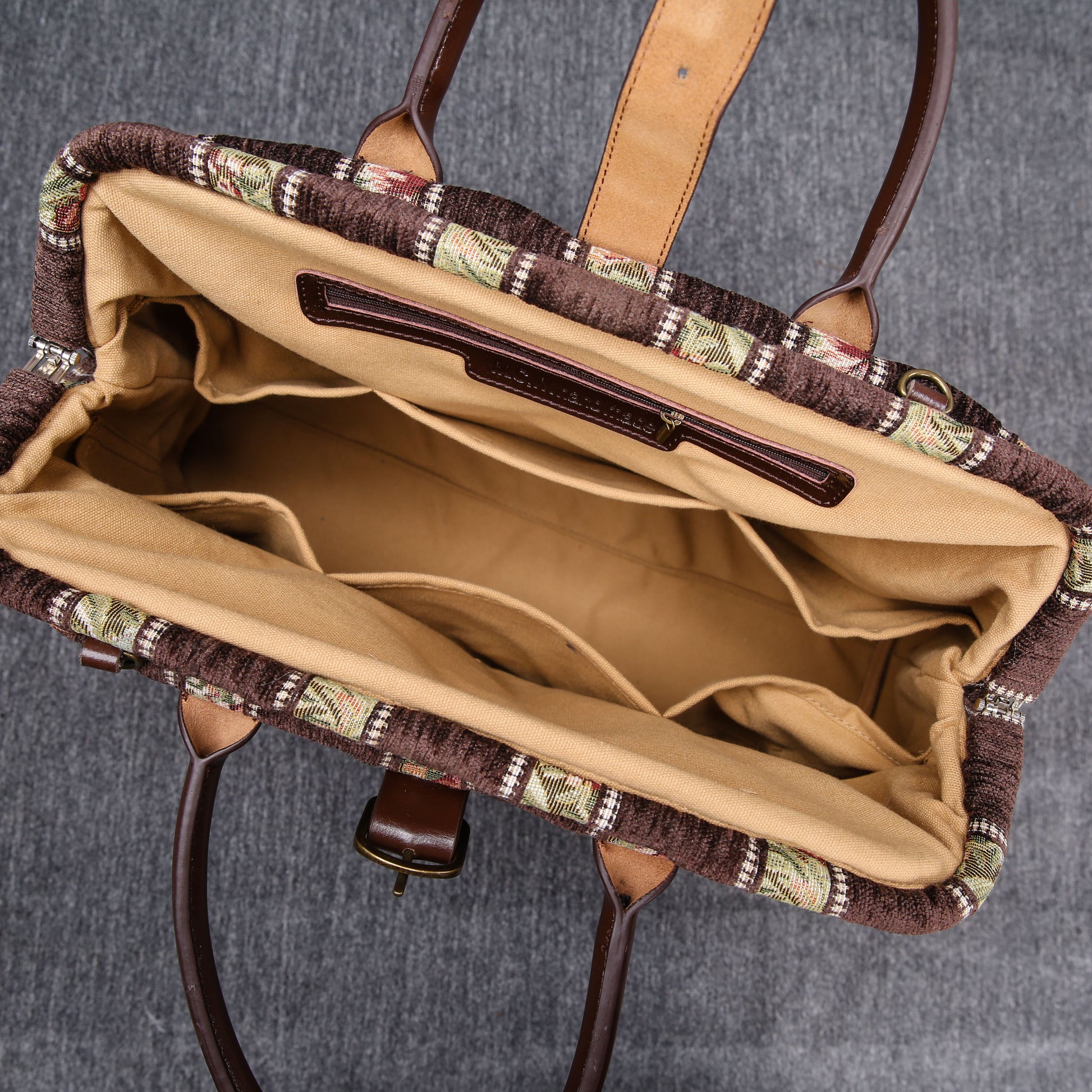 This is an elegant and classic bag of premium quality, the main body is made of thick chenille carpet, it can stand still on its own; The handles and belt are genuine leather, heavy cotton canvas lining, 6 bronze stands at bottom, every bag comes with a detachable and adjustable shoulder strap 55”in length, made from the same chenille as the bag, and fixed with high quality bronze hookers on the two ends.