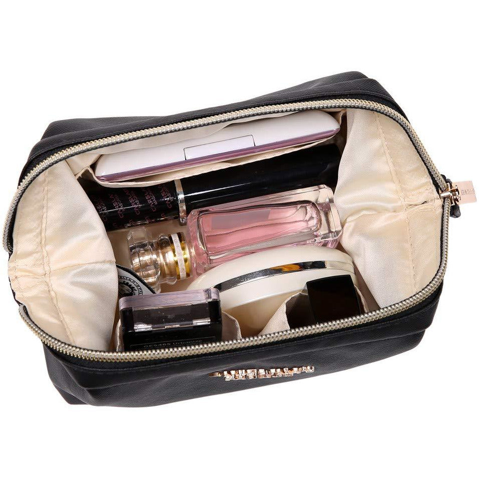 - This cosmetic bag uses metal zippers. It has 3 open pouches, for keys, passports, watches, sunglasses, lipsticks, fragrance, facial cream, mascara cream and other makeup items.