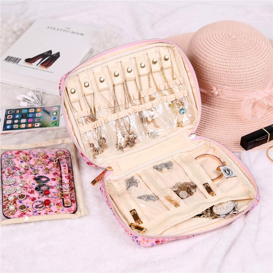- This gorgeous travel jewelry bag is made of vegan leather surface and satin lining, effectively protect your jewelry from damage and scratch.