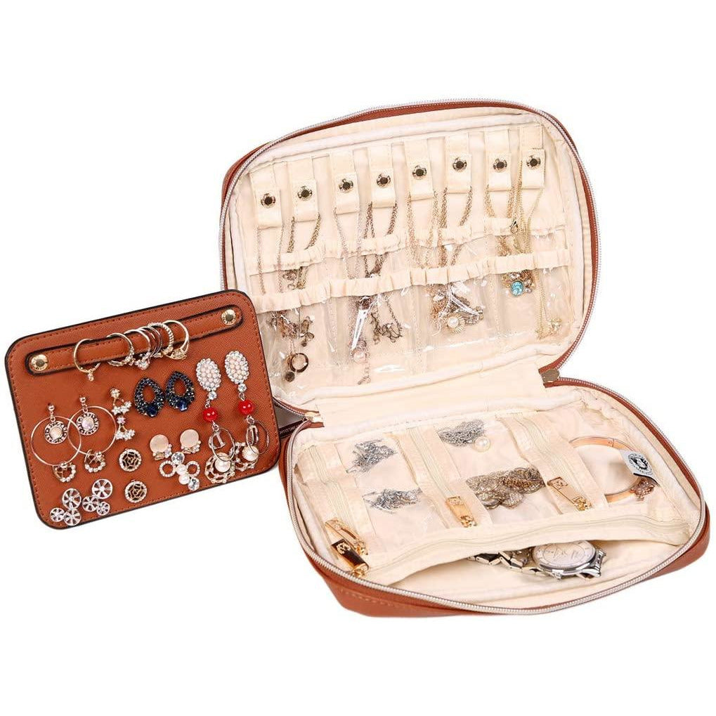 - This jewelry bag uses double metal zippers. The top compartment has 8 stays/bars wich can hold 8 necklaces with 8 transparent delicate pouches. The main compartment has 1 big zippered pouch and 1 open pouch,3 delicate zippered transparent pouches which hold 10 necklaces credit card, sungalss, phone, keys, earrings, rings, watches and other accessories. This case has 1 zippered transparent pouch with 1 plastic board which hold 14 pairs of ear rings and 6-9 rings.