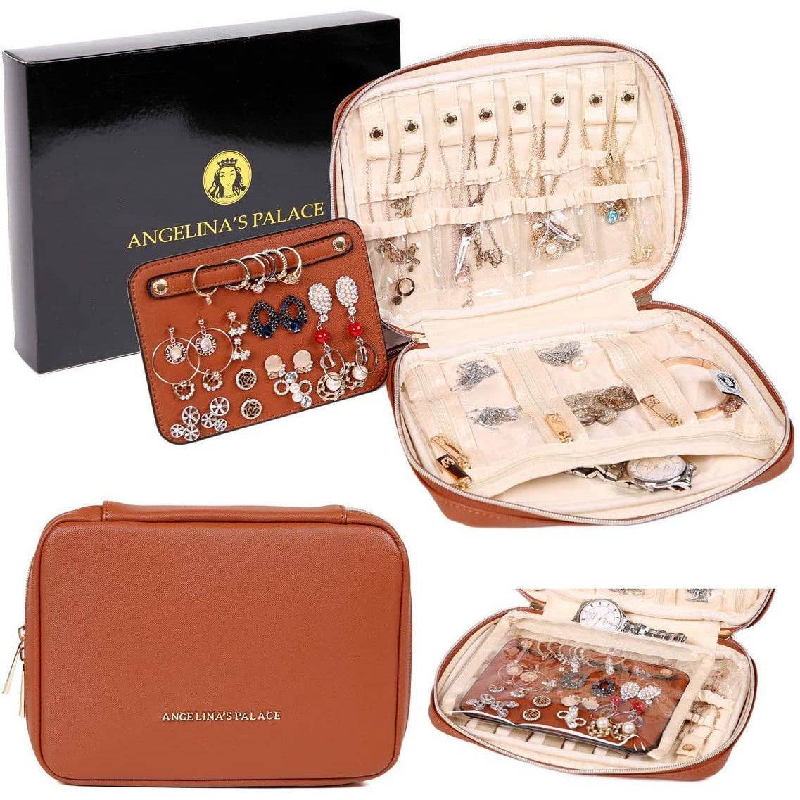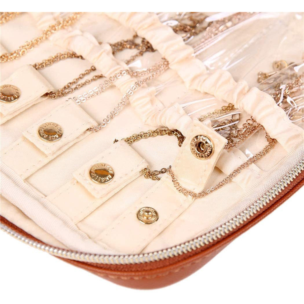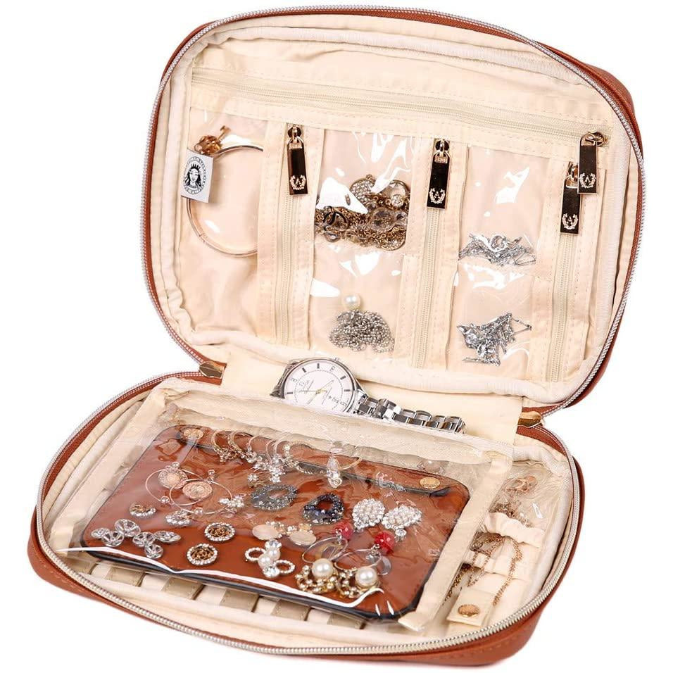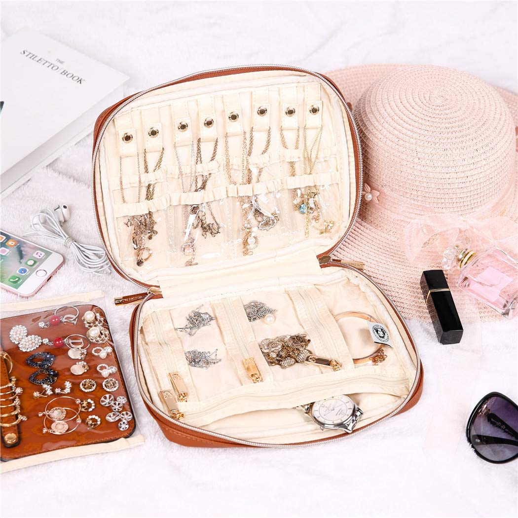 - This gorgeous travel jewelry bag is made of vegan leather surface and satin lining, effectively protect your jewelry from damage and scratch.