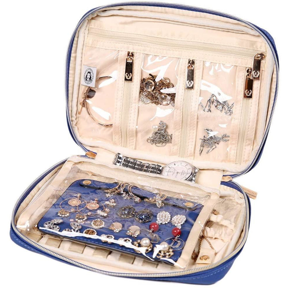 - This jewelry bag uses double metal zippers. The top compartment has 8 stays/bars wich can hold 8 necklaces with 8 transparent delicate pouches. The main compartment has 1 big zippered pouch and 1 open pouch,3 delicate zippered transparent pouches which hold 10 necklaces credit card, sungalss, phone, keys, earrings, rings, watches and other accessories. This case has 1 zippered transparent pouch with 1 plastic board which hold 14 pairs of ear rings and 6-9 rings.