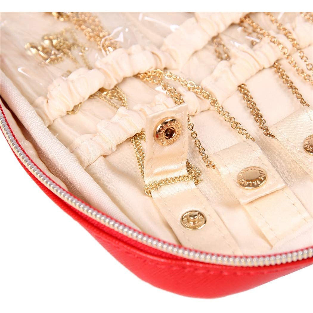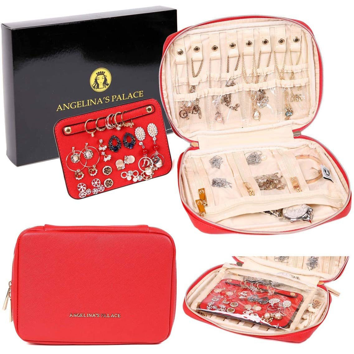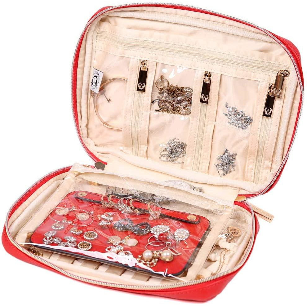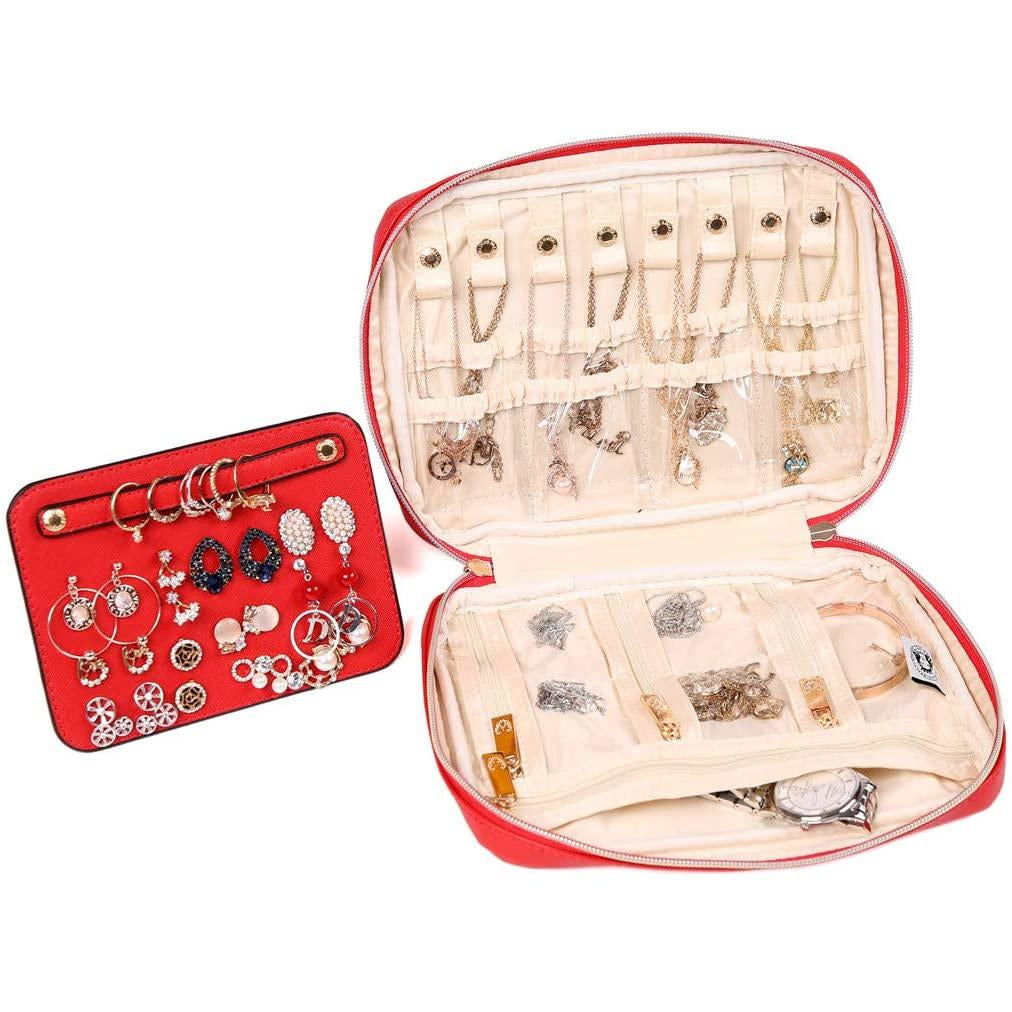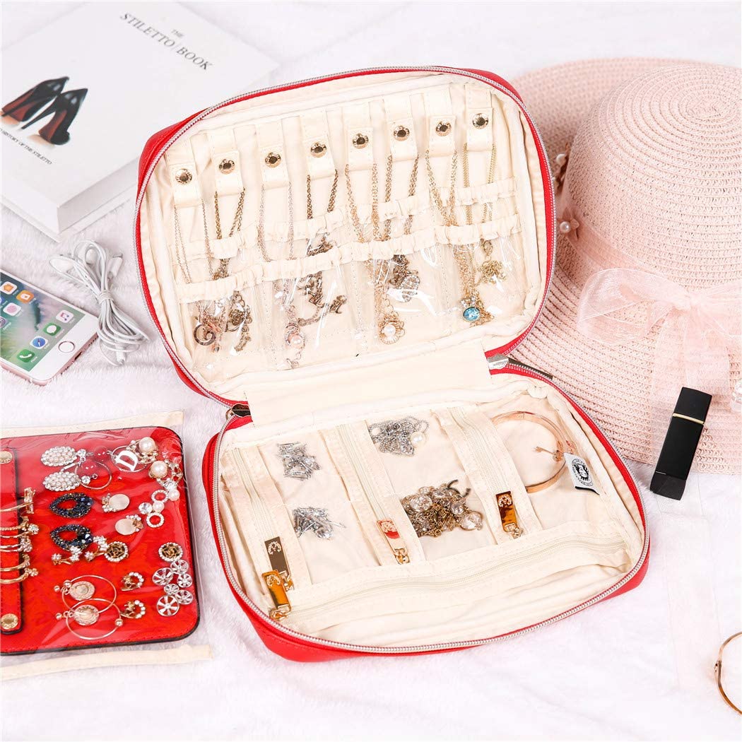 - This gorgeous travel jewelry bag is made of vegan leather surface and satin lining, effectively protect your jewelry from damage and scratch.