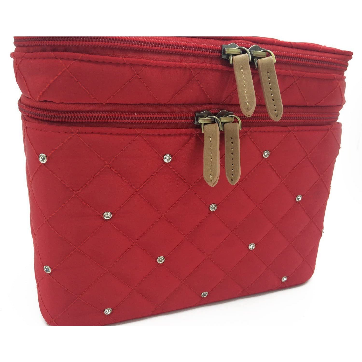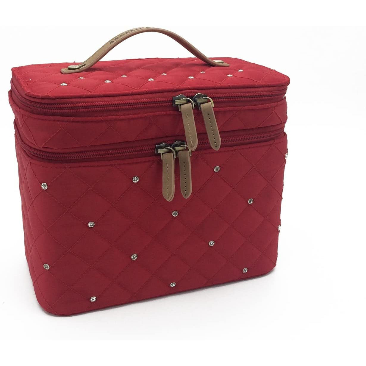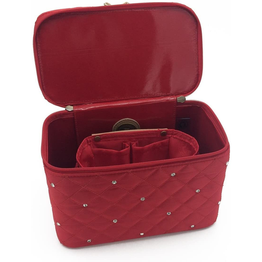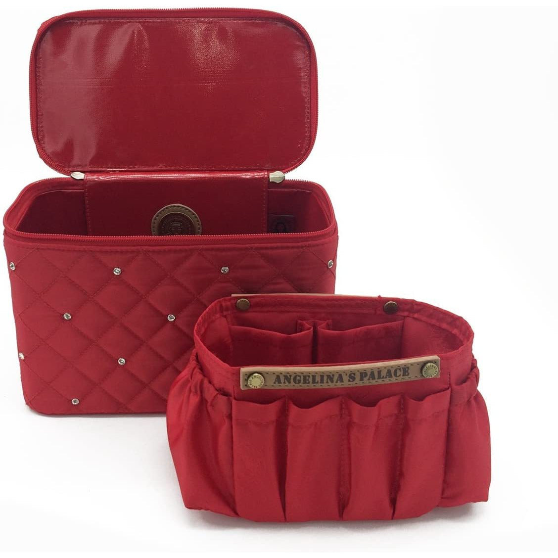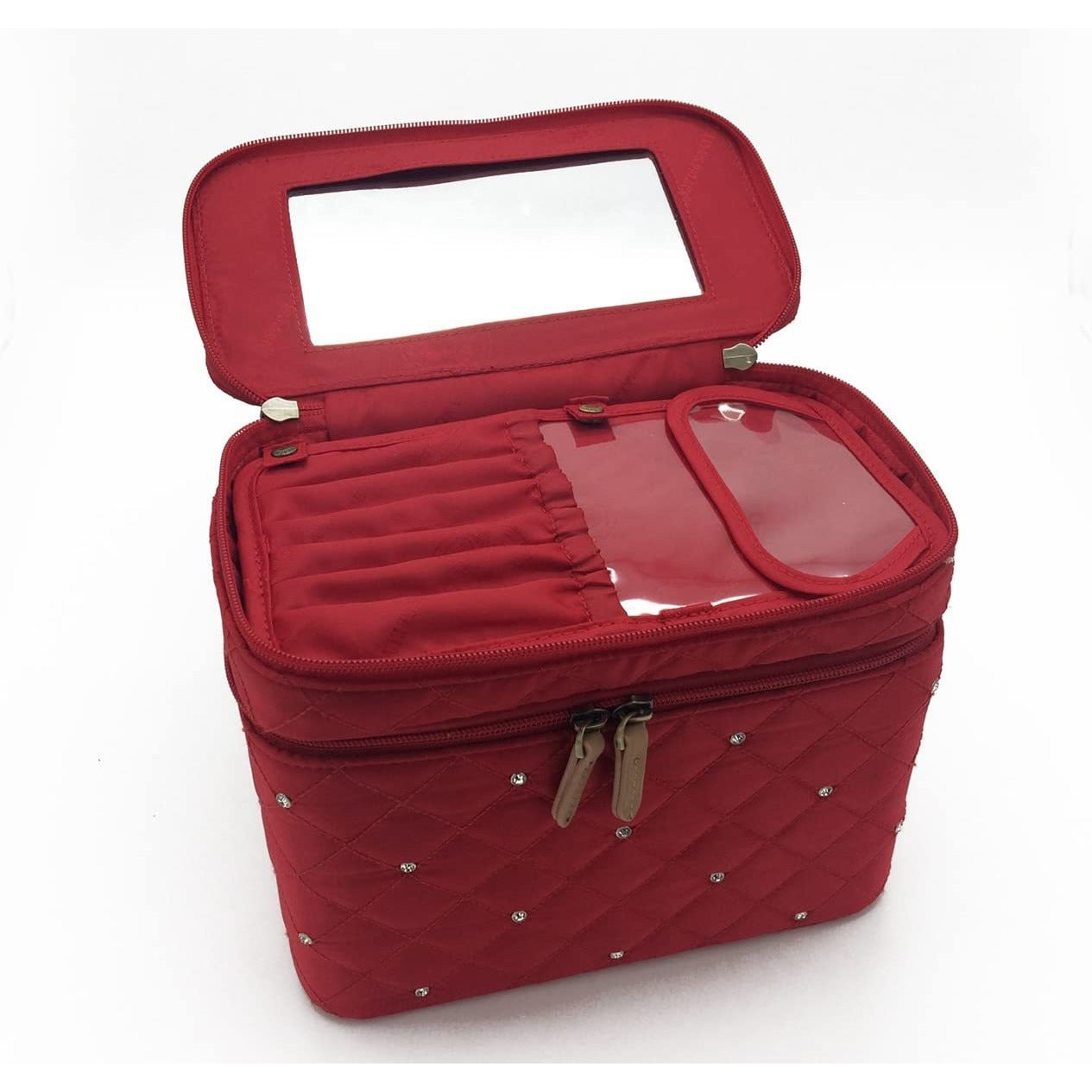 - Roomy main compartment contains all-in-one cosmetic organizer