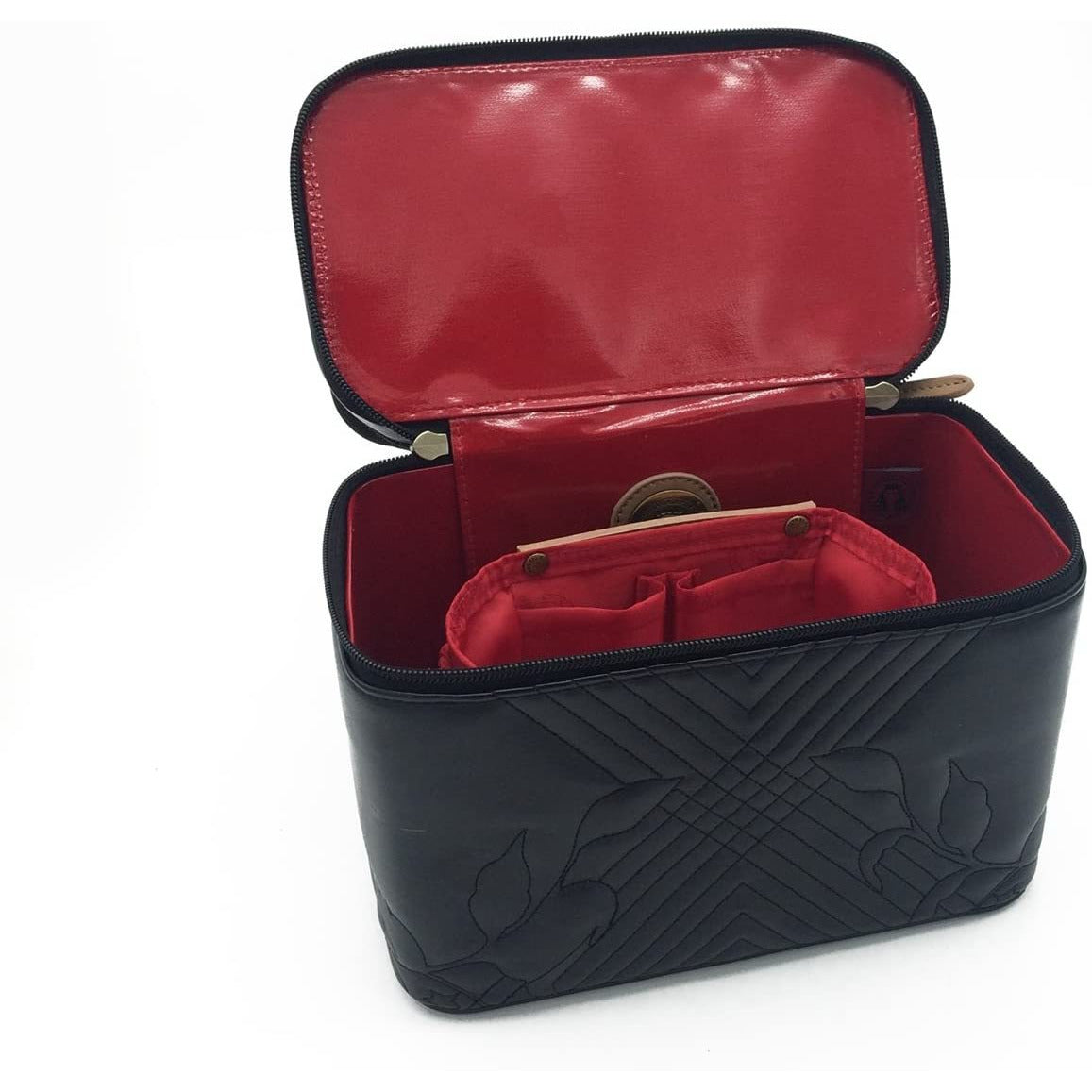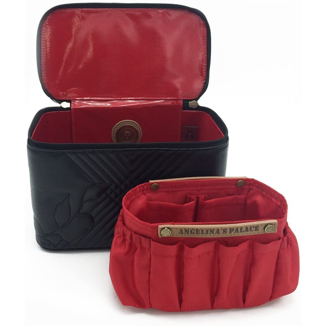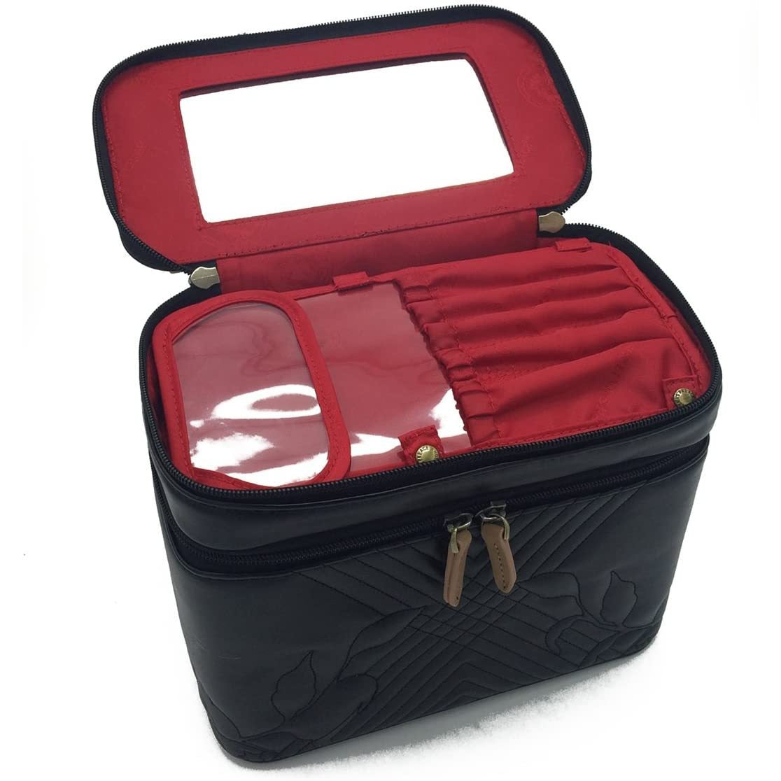 - Roomy main compartment contains all-in-one cosmetic organizer
