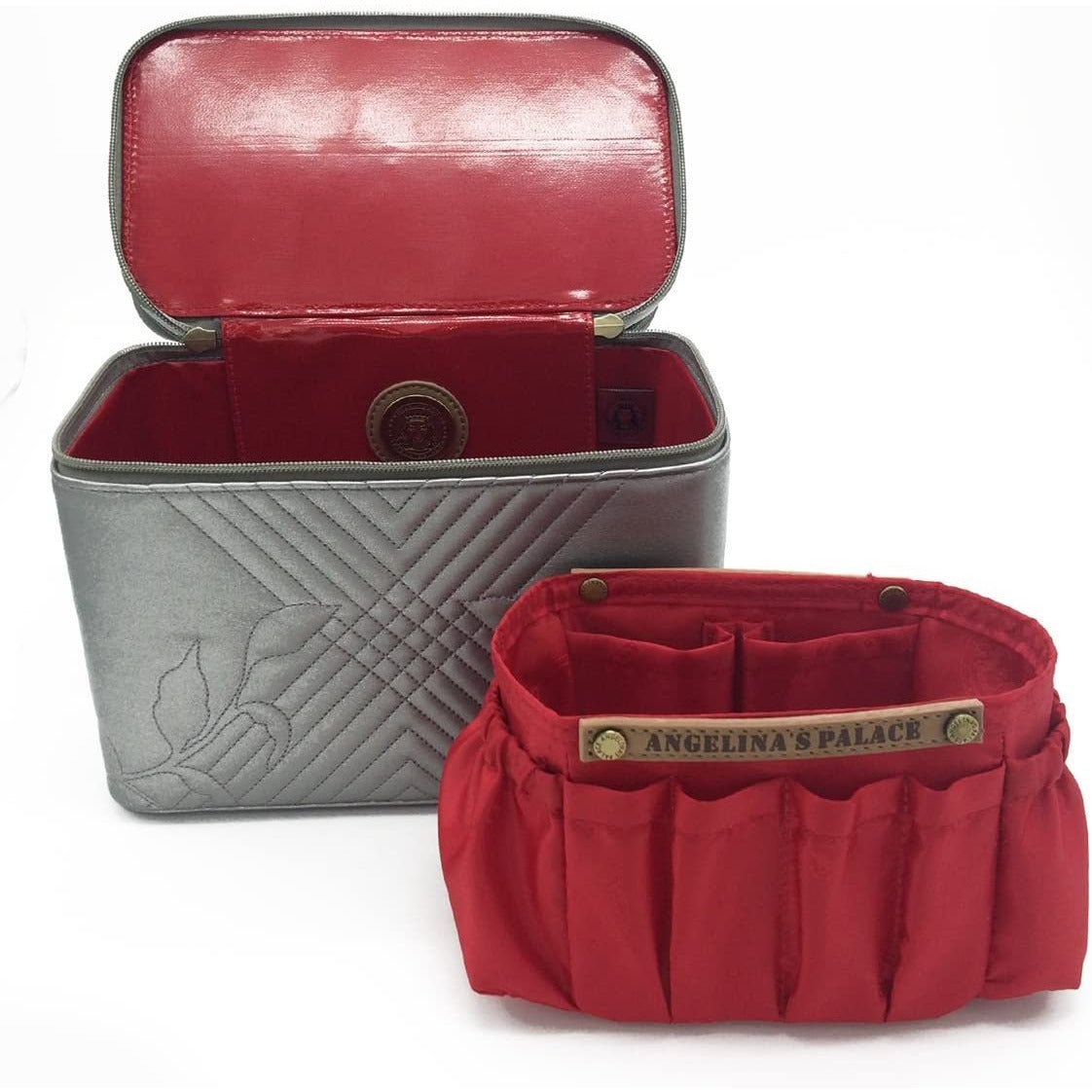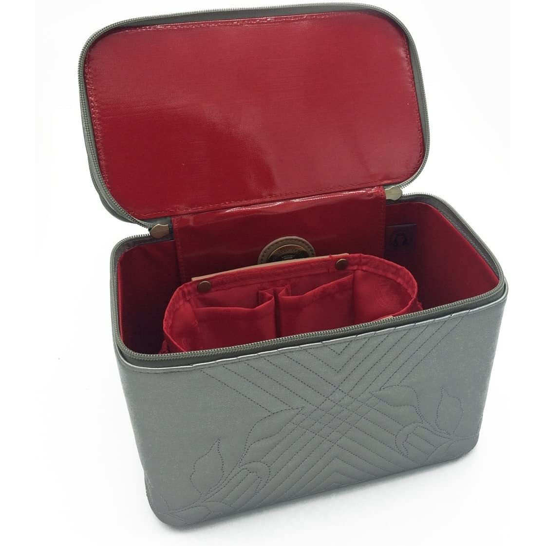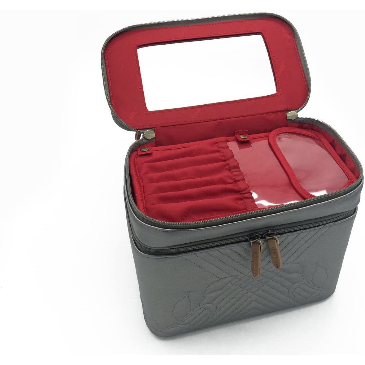 - Roomy main compartment contains all-in-one cosmetic organizer