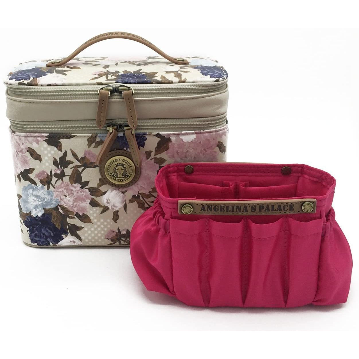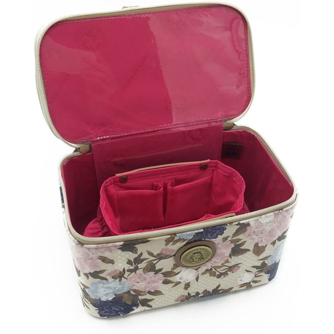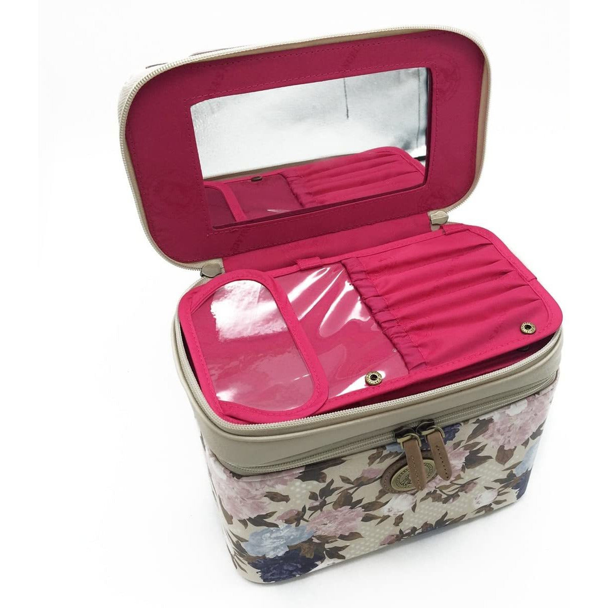 - Roomy main compartment contains all-in-one cosmetic organizer