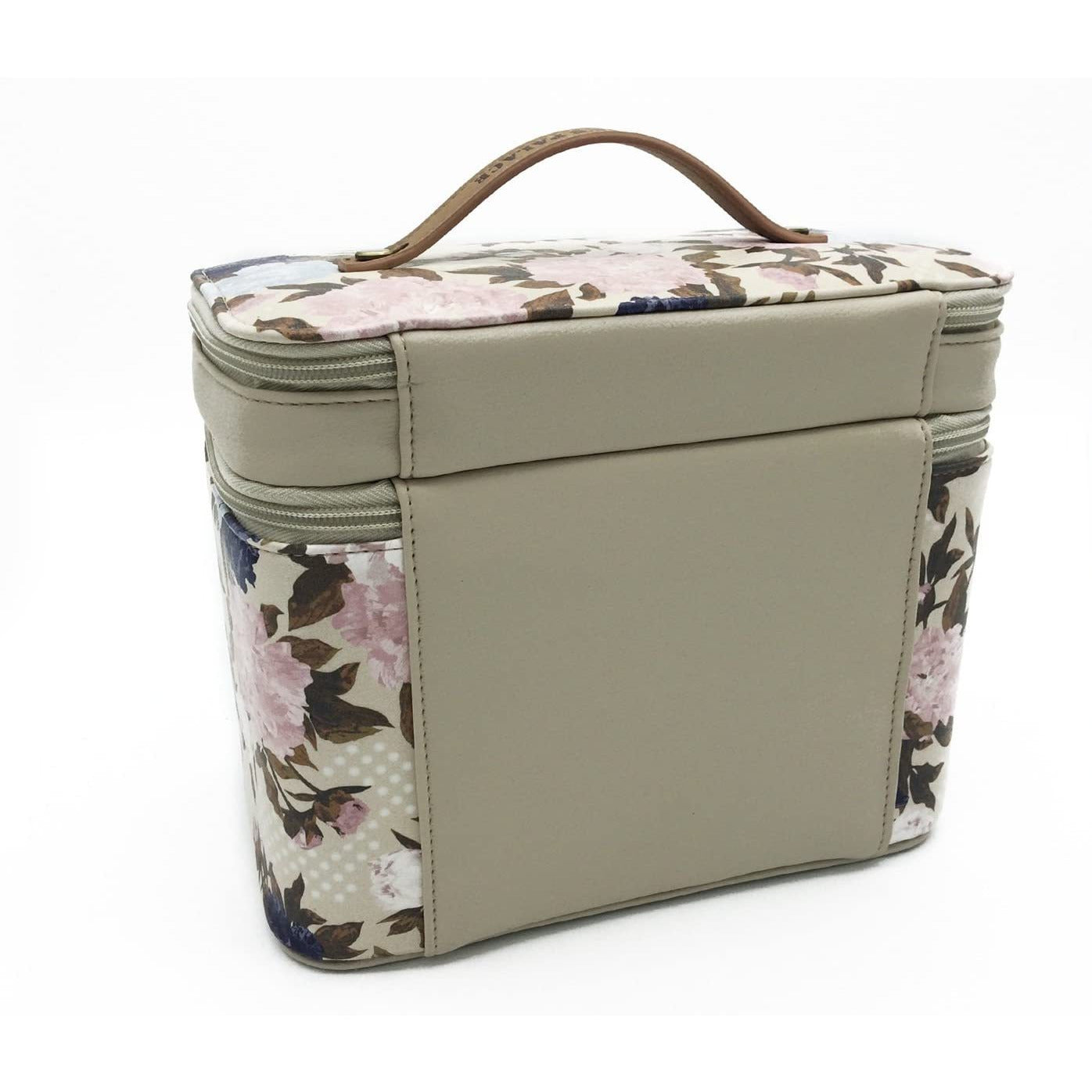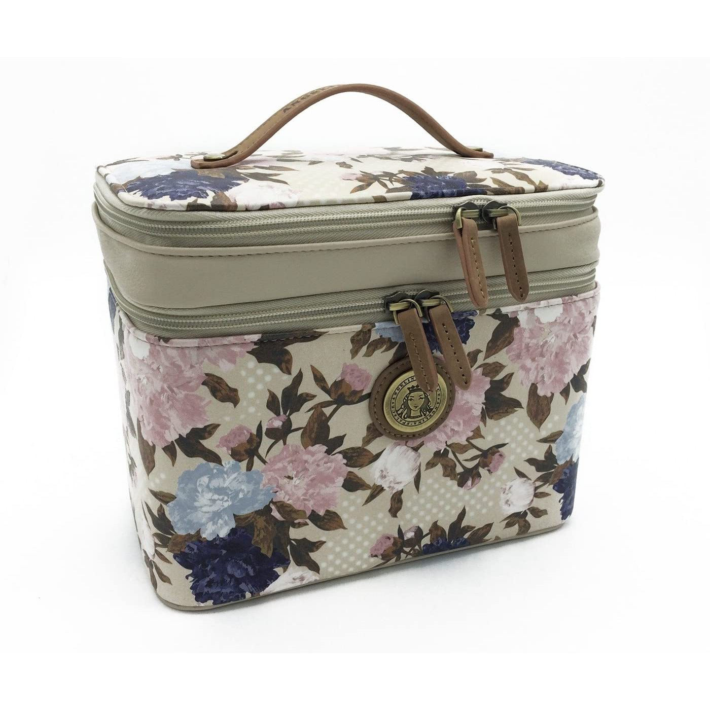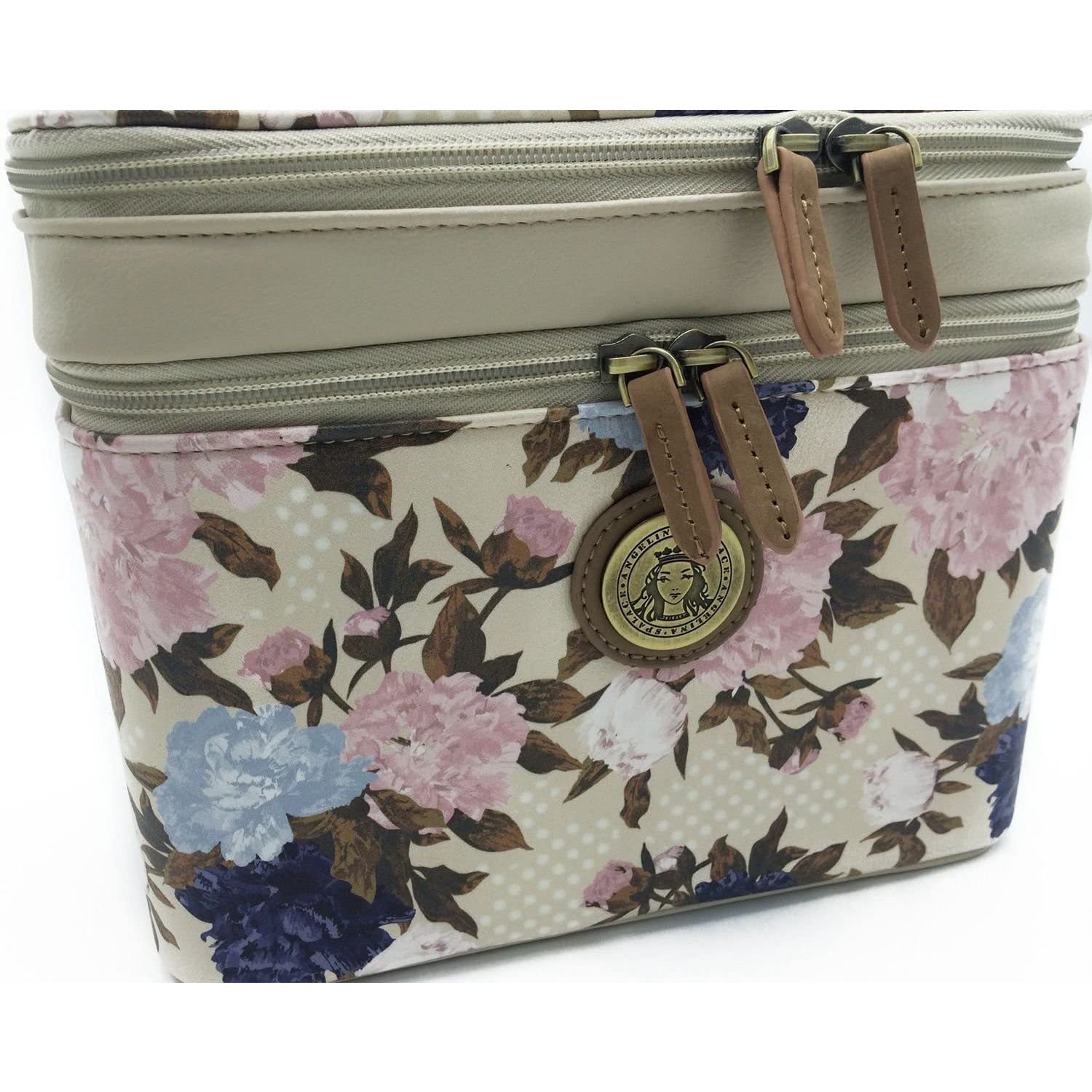 - Roomy main compartment contains all-in-one cosmetic organizer