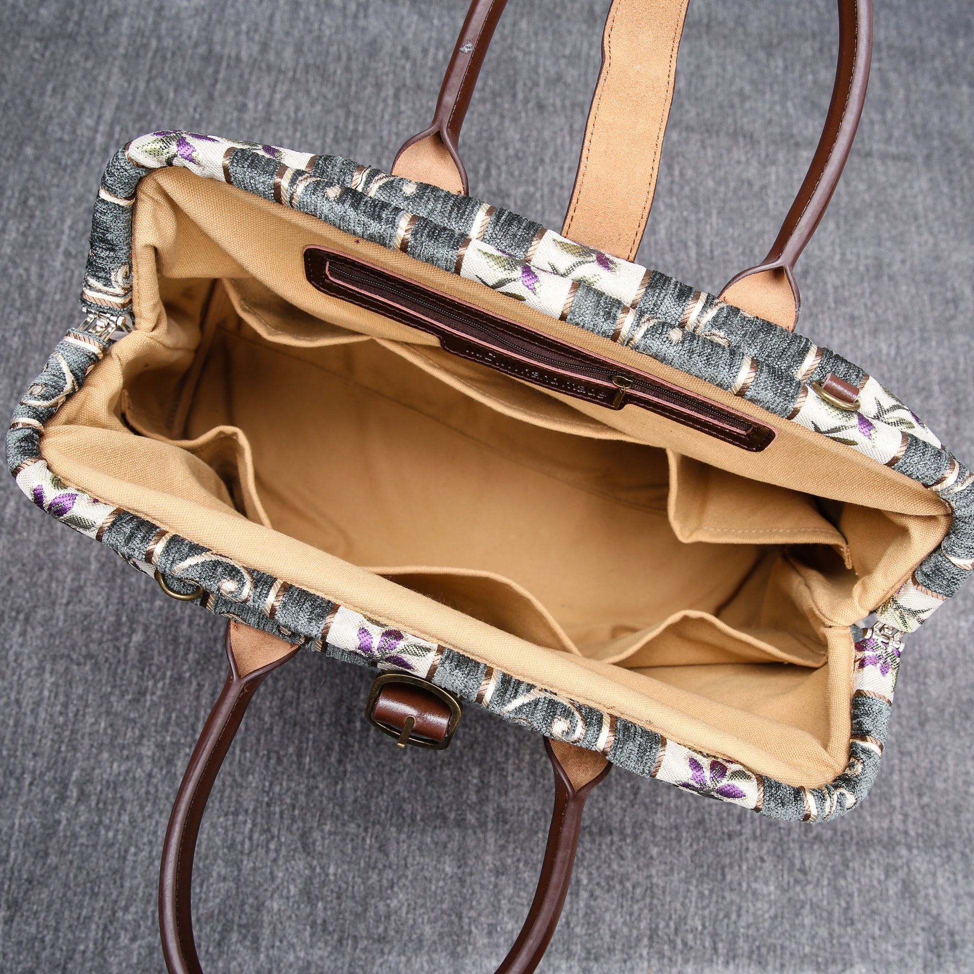 This is an elegant and classic bag of premium quality, the main body is made of thick chenille carpet, it can stand still on its own; The handles and belt are genuine leather, heavy cotton canvas lining, 6 bronze stands at bottom, every bag comes with a detachable and adjustable shoulder strap 55”in length, made from the same chenille as the bag, and fixed with high quality bronze hookers on the two ends.