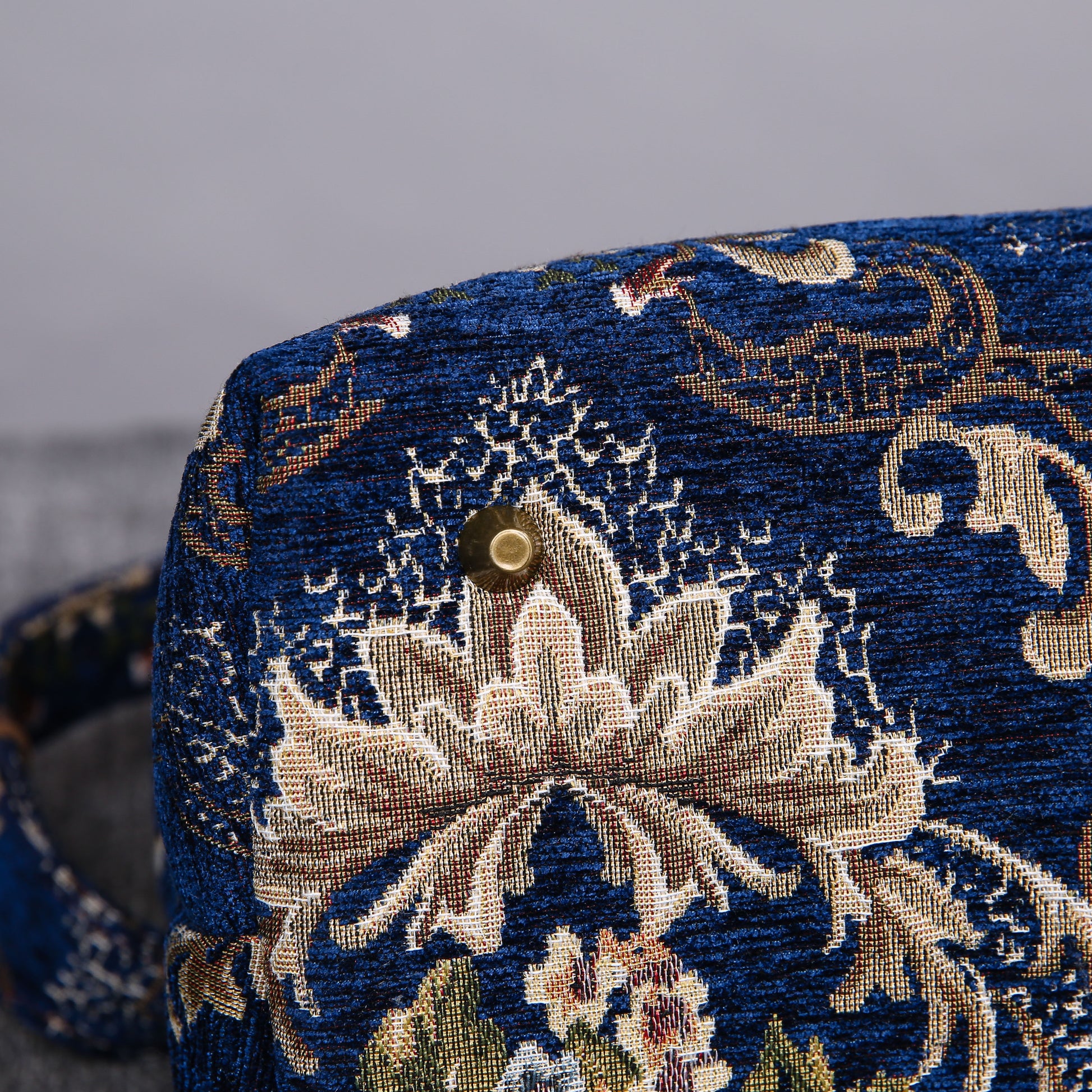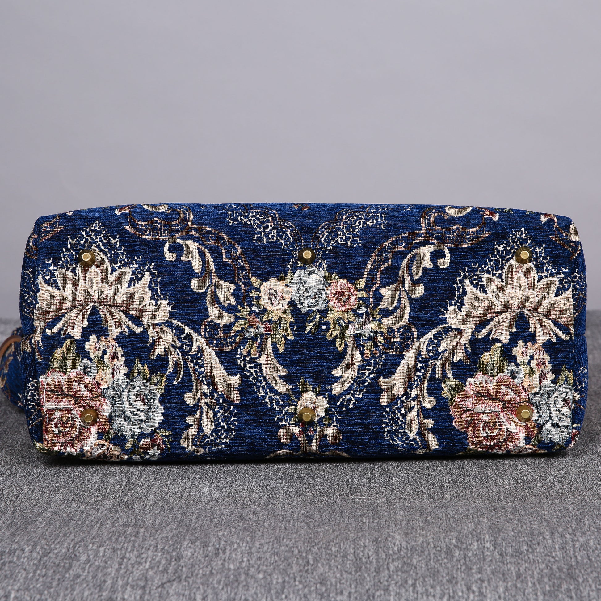 This is an elegant and classic bag of premium quality, the main body is made of thick chenille carpet, it can stand still on its own; The handles and belt are genuine leather, heavy cotton canvas lining, decorated with copper Victorian button on front panel, 6 bronze stands at bottom, every bag comes with a detachable and adjustable shoulder strap 55”in length, made from the same chenille as the bag, and fixed with high quality bronze hookers on the two ends.