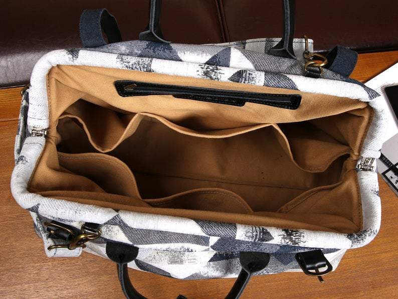 This classic carpet bag is very durable and practical, the main body is made of thick chenille carpet fabric, the handles and belt are genuine leather, heavy cotton canvas lining, 6 bronze stands at bottom, every bag comes with a detachable and adjustable shoulder strap 55”in length, made from the same chenille as the bag, and fixed with high quality bronze hookers on the two ends.