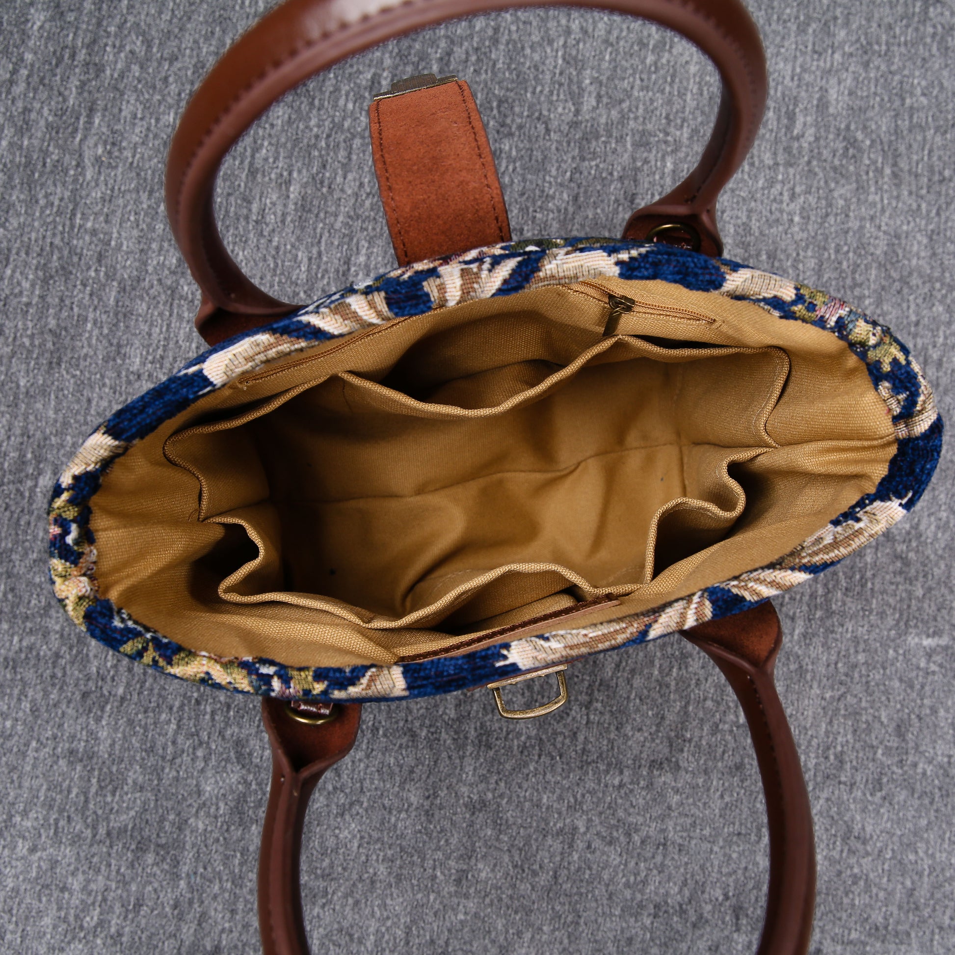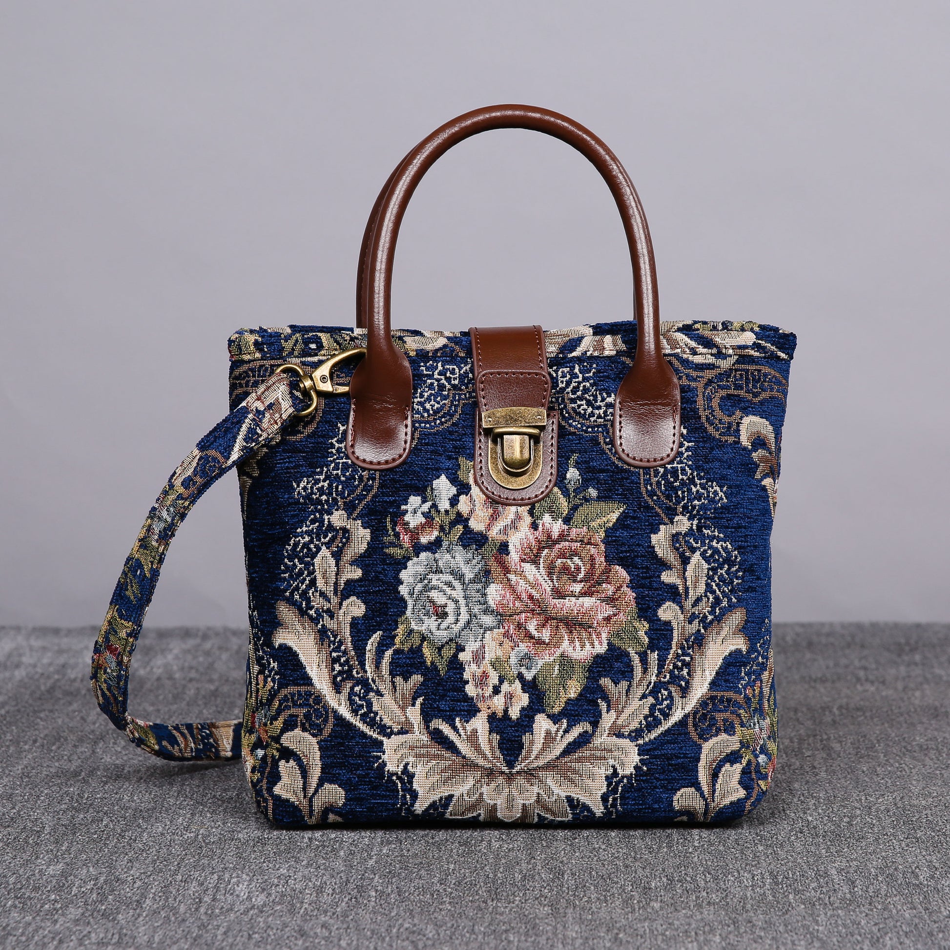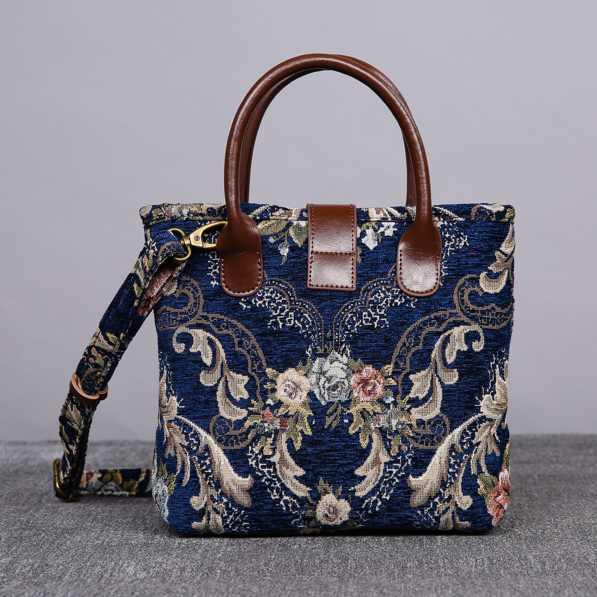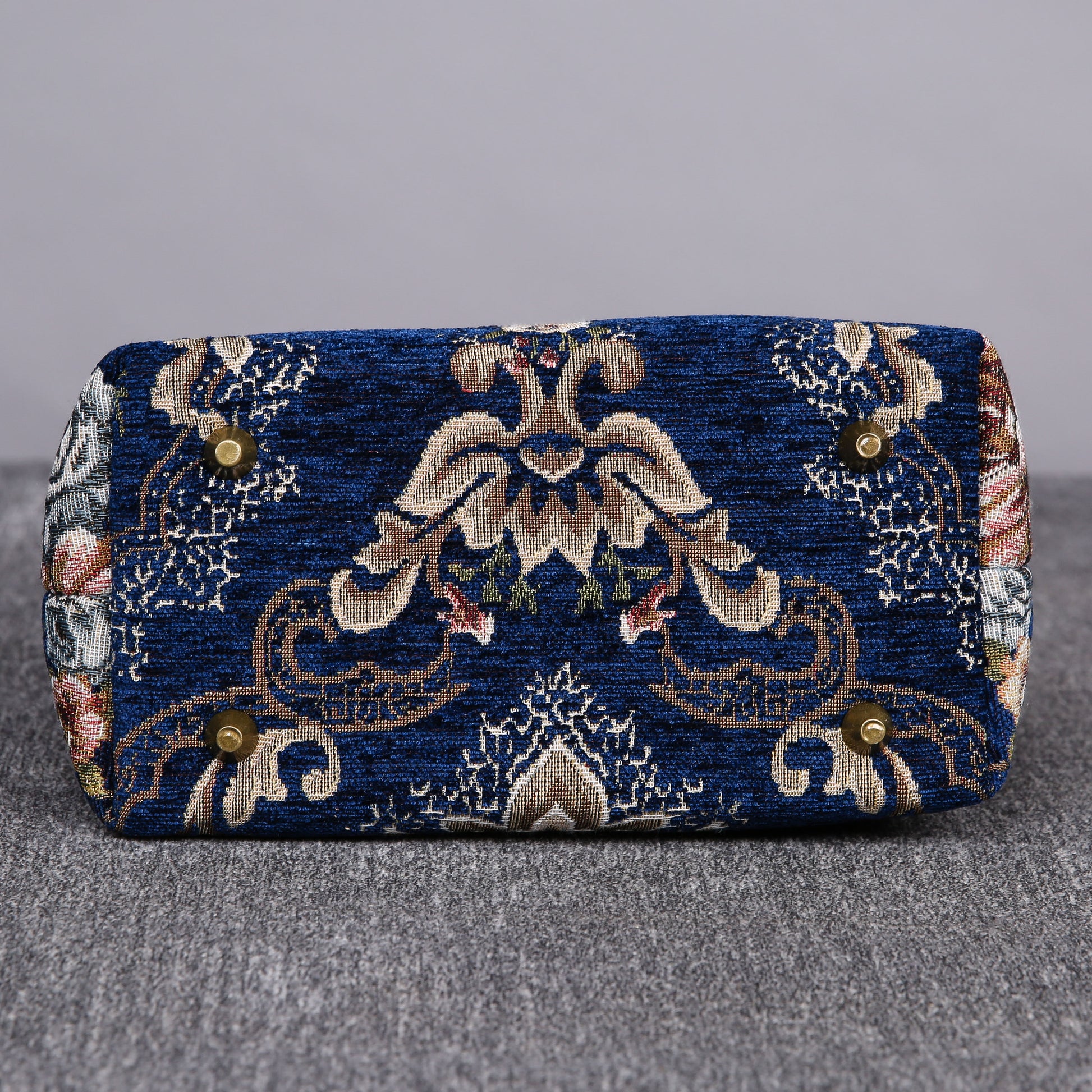 This classic carpet bag is very durable and practical, the main body is made of thick chenille carpet fabric, the handles and belt are genuine leather, heavy cotton canvas lining, 6 bronze stands at bottom, every bag comes with a detachable and adjustable shoulder strap 55”in length, made from the same chenille as the bag, and fixed with high quality bronze hookers on the two ends.