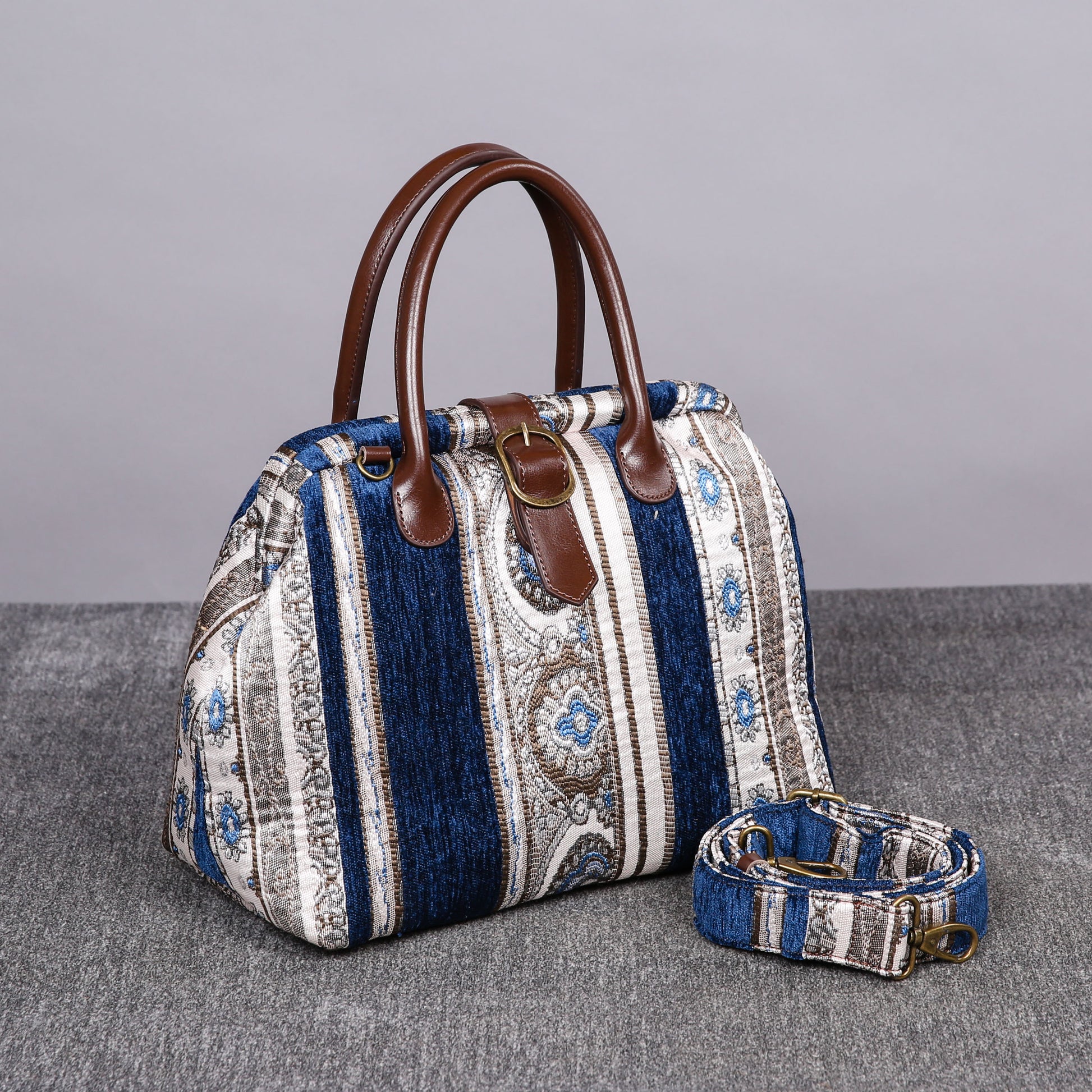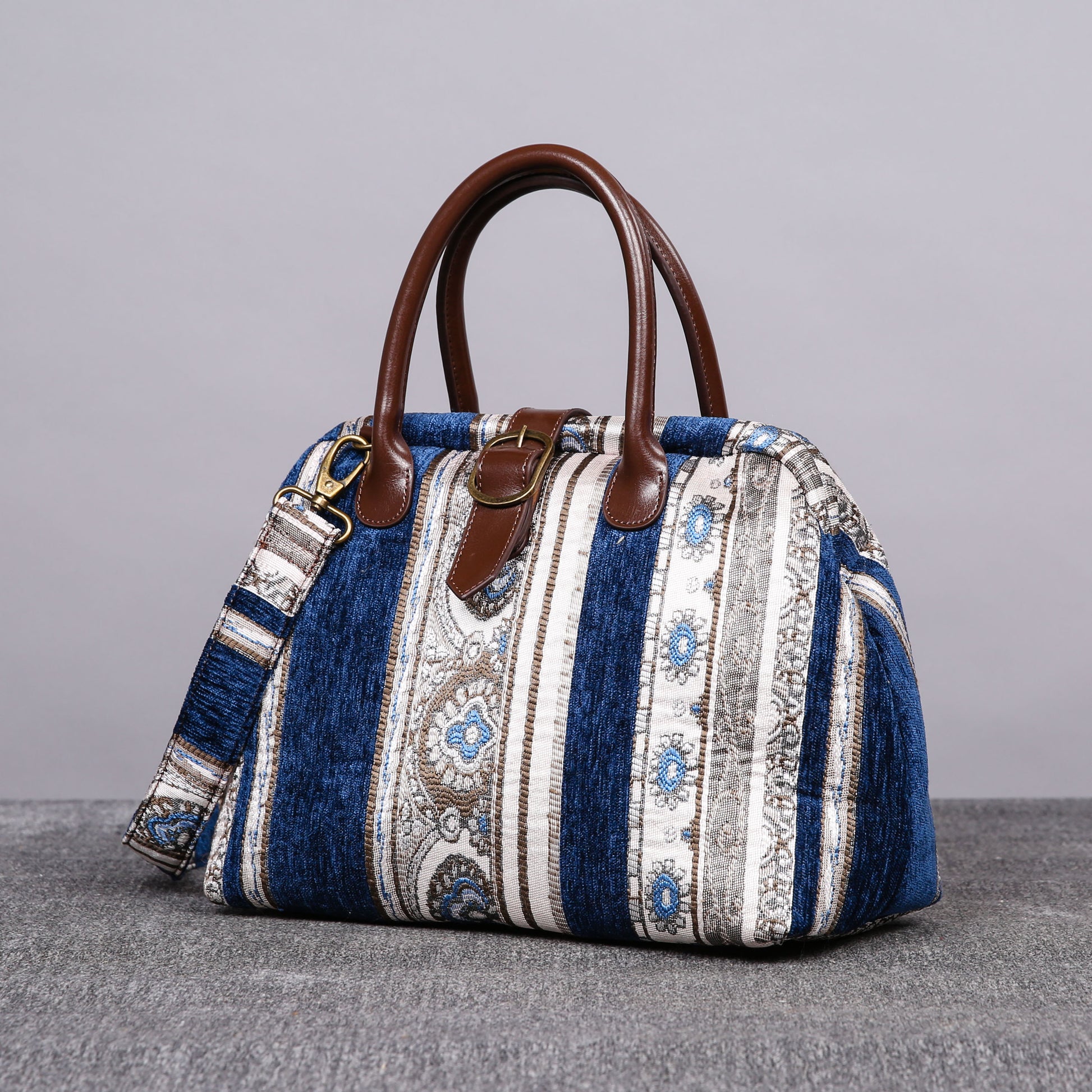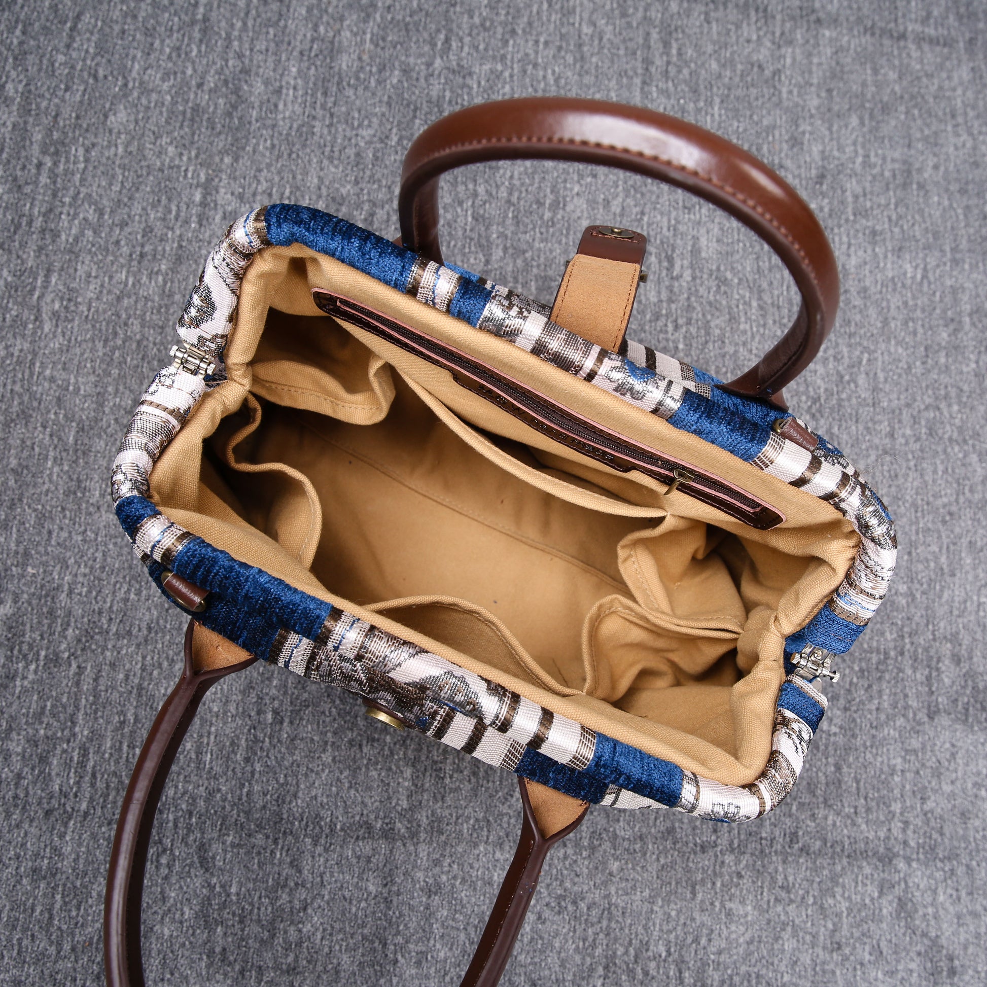 This purse size carpet bag is really adorable, the bag can stand still on its own as it is made of thick chenille carpet; The handles and belt are genuine leather, heavy cotton canvas lining, 6 bronze stands at bottom, every bag comes with a detachable and adjustable shoulder strap 55”in length, made from the same chenille as the bag, and fixed with high quality bronze hookers on the two ends.
