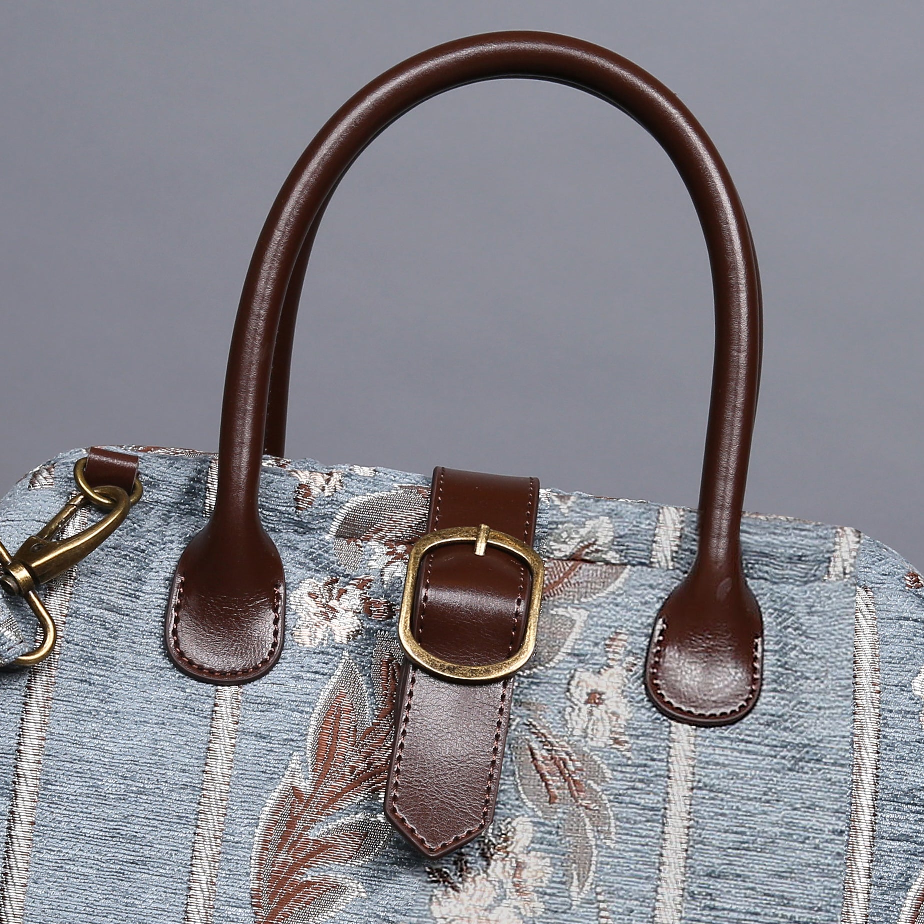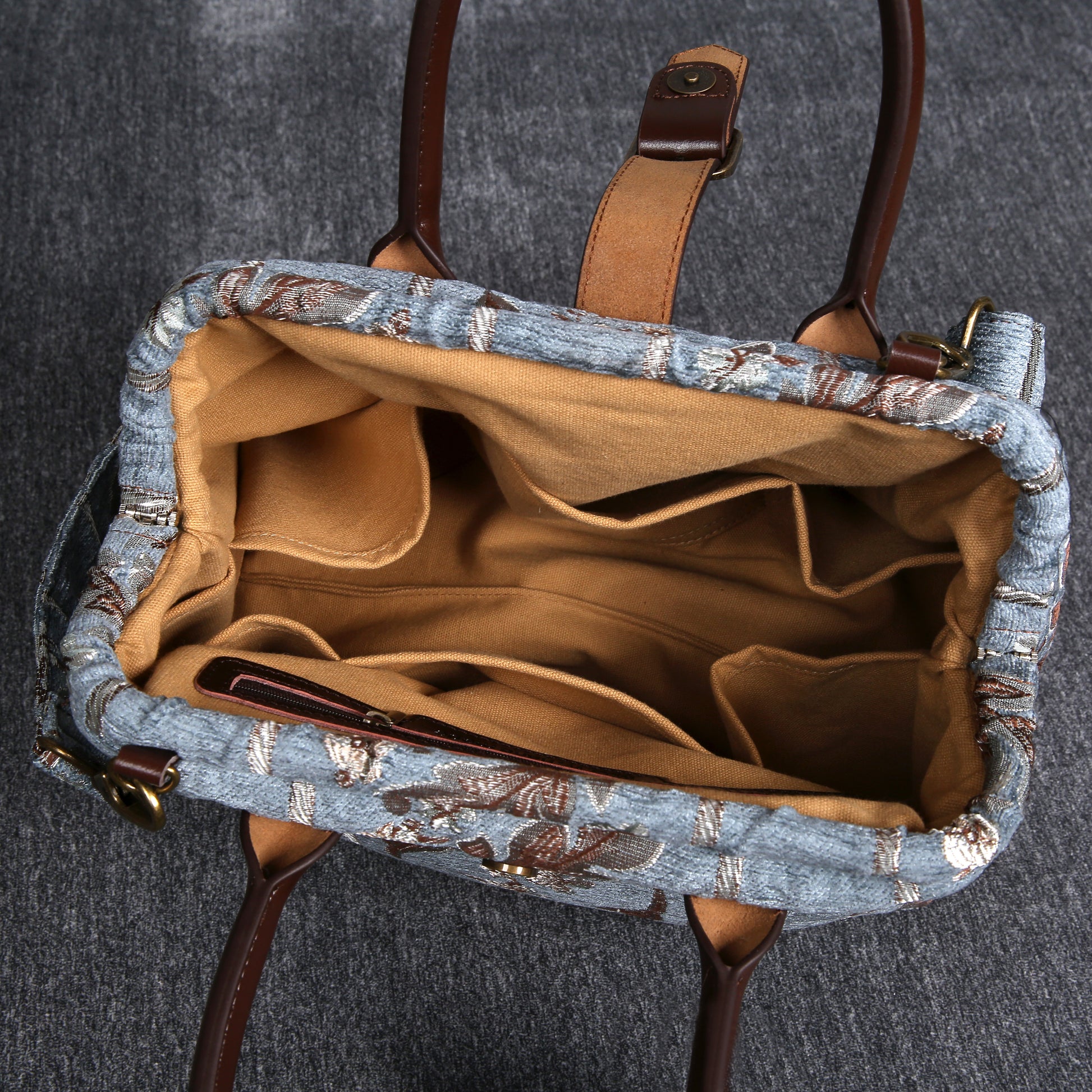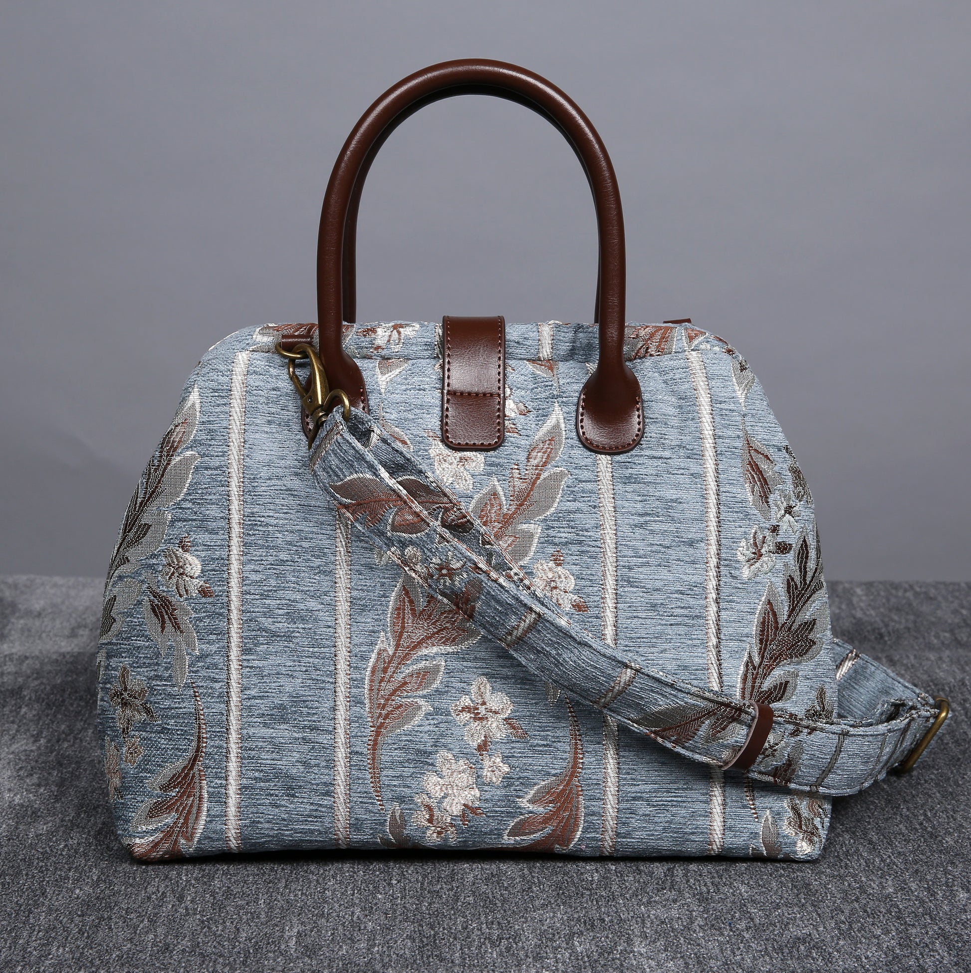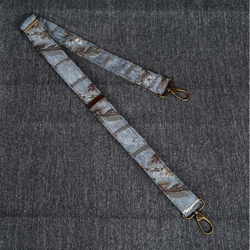 This purse size carpet bag is really adorable, the bag can stand still on its own as it is made of thick chenille carpet; The handles and belt are genuine leather, heavy cotton canvas lining, 6 bronze stands at bottom, every bag comes with a detachable and adjustable shoulder strap 55”in length, made from the same chenille as the bag, and fixed with high quality bronze hookers on the two ends.