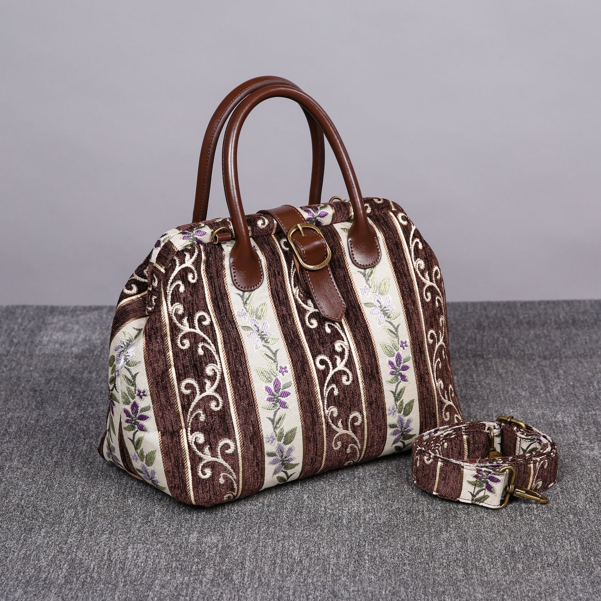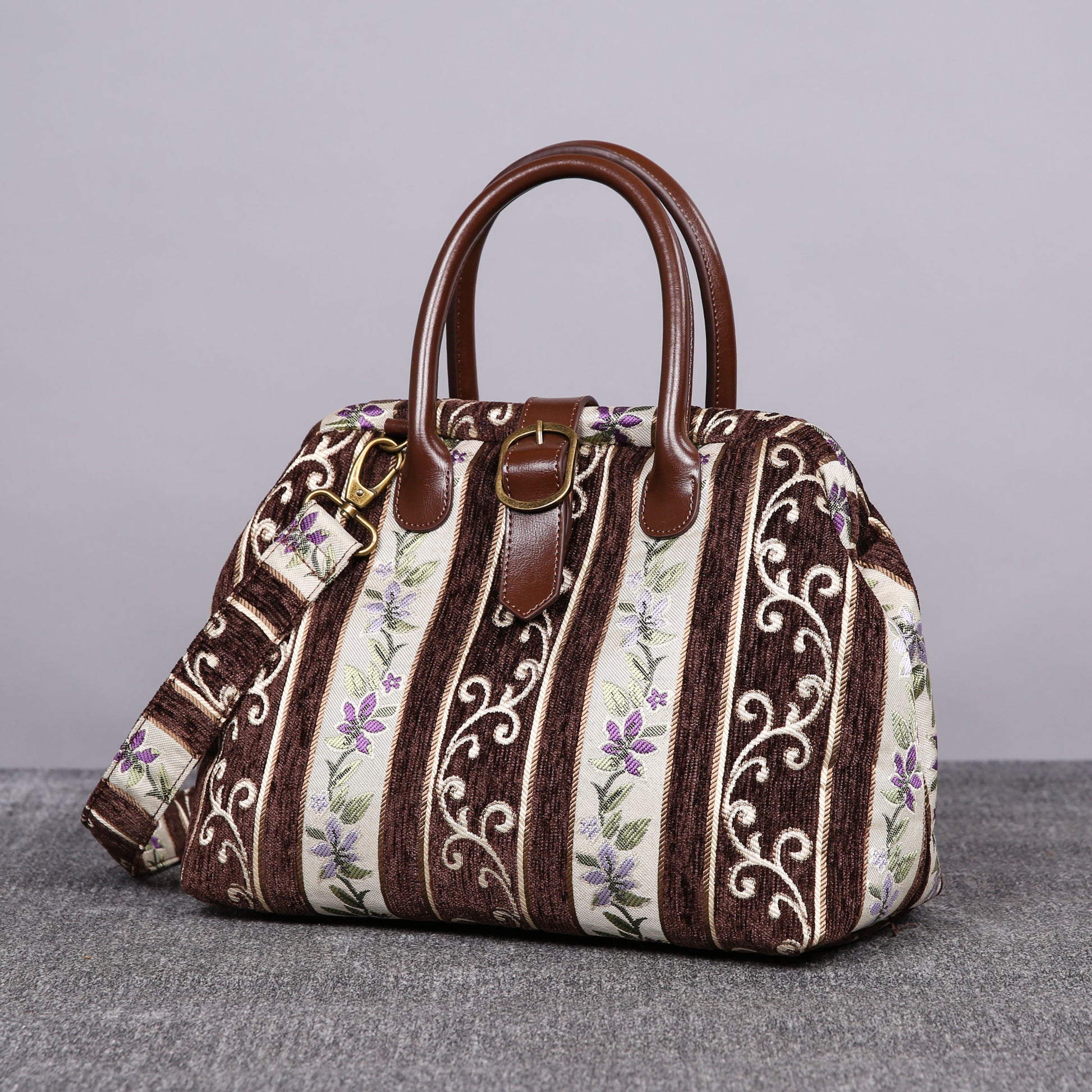 This purse size carpet bag is really adorable, the bag can stand still on its own as it is made of thick chenille carpet; The handles and belt are genuine leather, heavy cotton canvas lining, 6 bronze stands at bottom, every bag comes with a detachable and adjustable shoulder strap 55”in length, made from the same chenille as the bag, and fixed with high quality bronze hookers on the two ends.