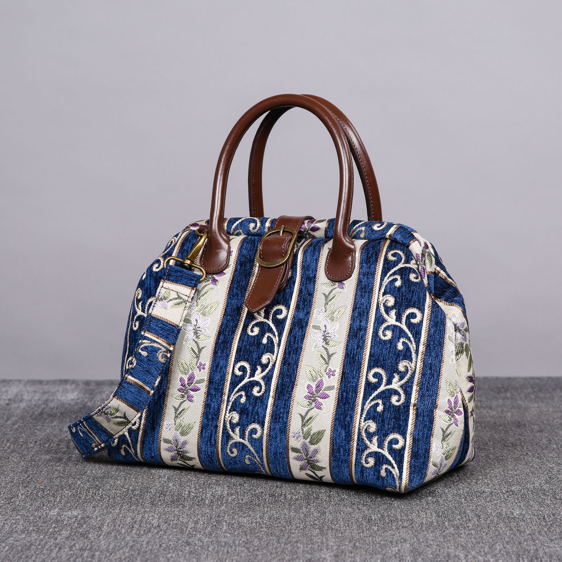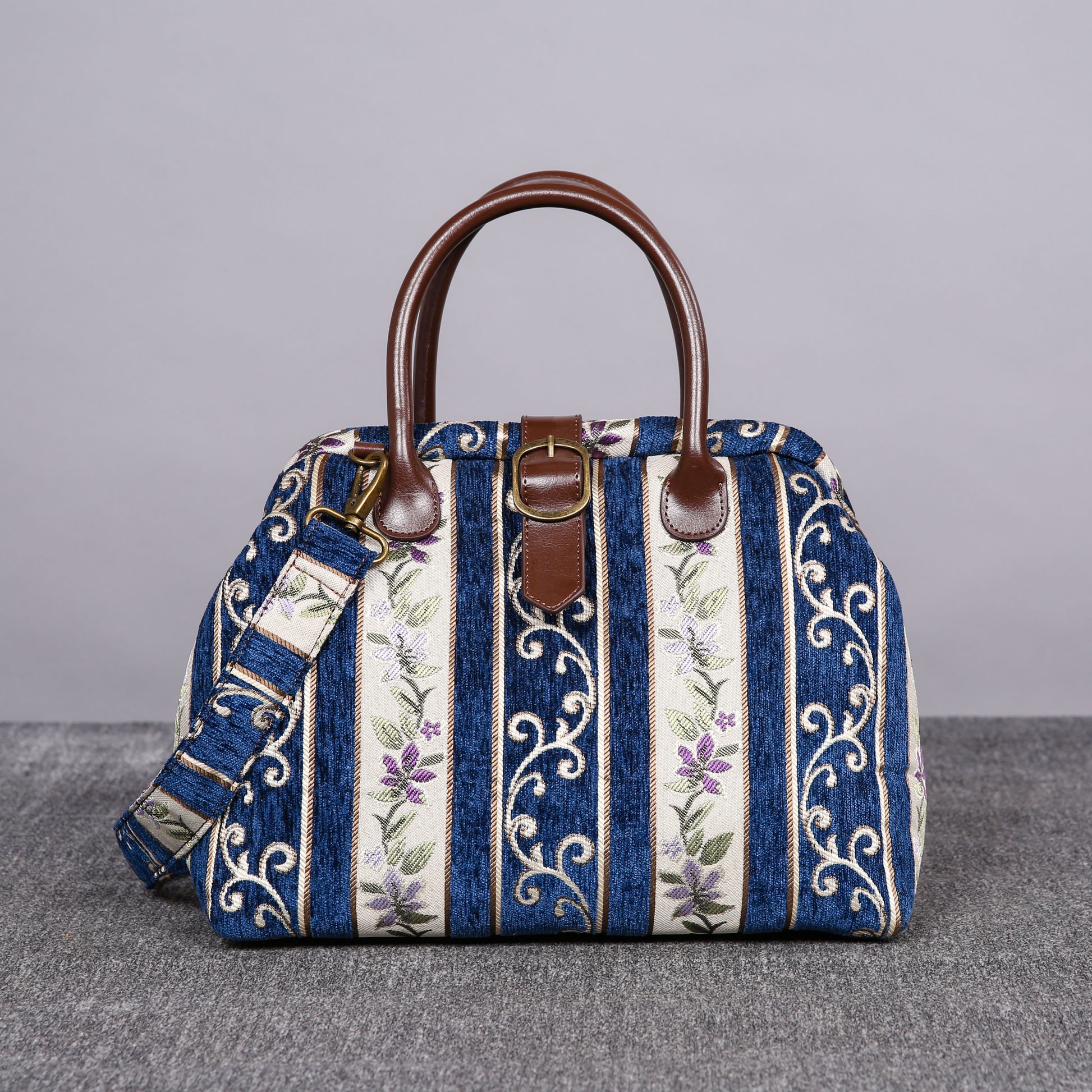 This purse size carpet bag is really adorable, the bag can stand still on its own as it is made of thick chenille carpet; The handles and belt are genuine leather, heavy cotton canvas lining, 6 bronze stands at bottom, every bag comes with a detachable and adjustable shoulder strap 55”in length, made from the same chenille as the bag, and fixed with high quality bronze hookers on the two ends.