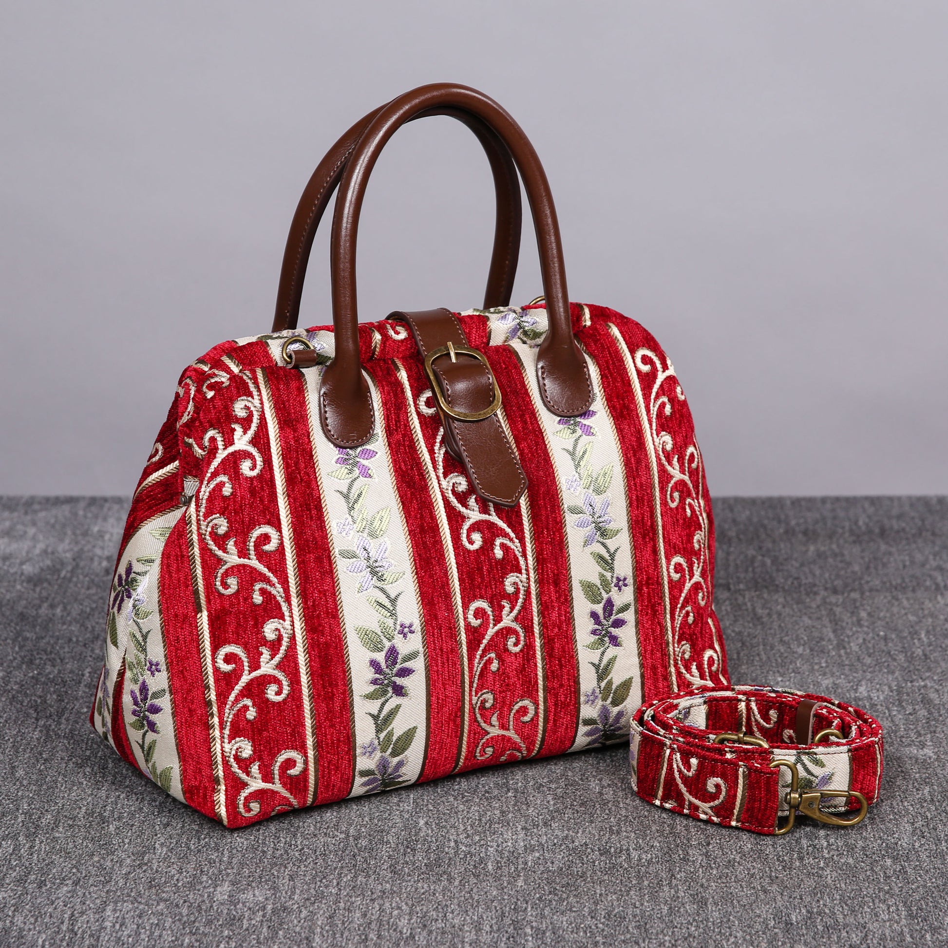 This purse size carpet bag is really adorable, the bag can stand still on its own as it is made of thick chenille carpet; The handles and belt are genuine leather, heavy cotton canvas lining, 6 bronze stands at bottom, every bag comes with a detachable and adjustable shoulder strap 55”in length, made from the same chenille as the bag, and fixed with high quality bronze hookers on the two ends.