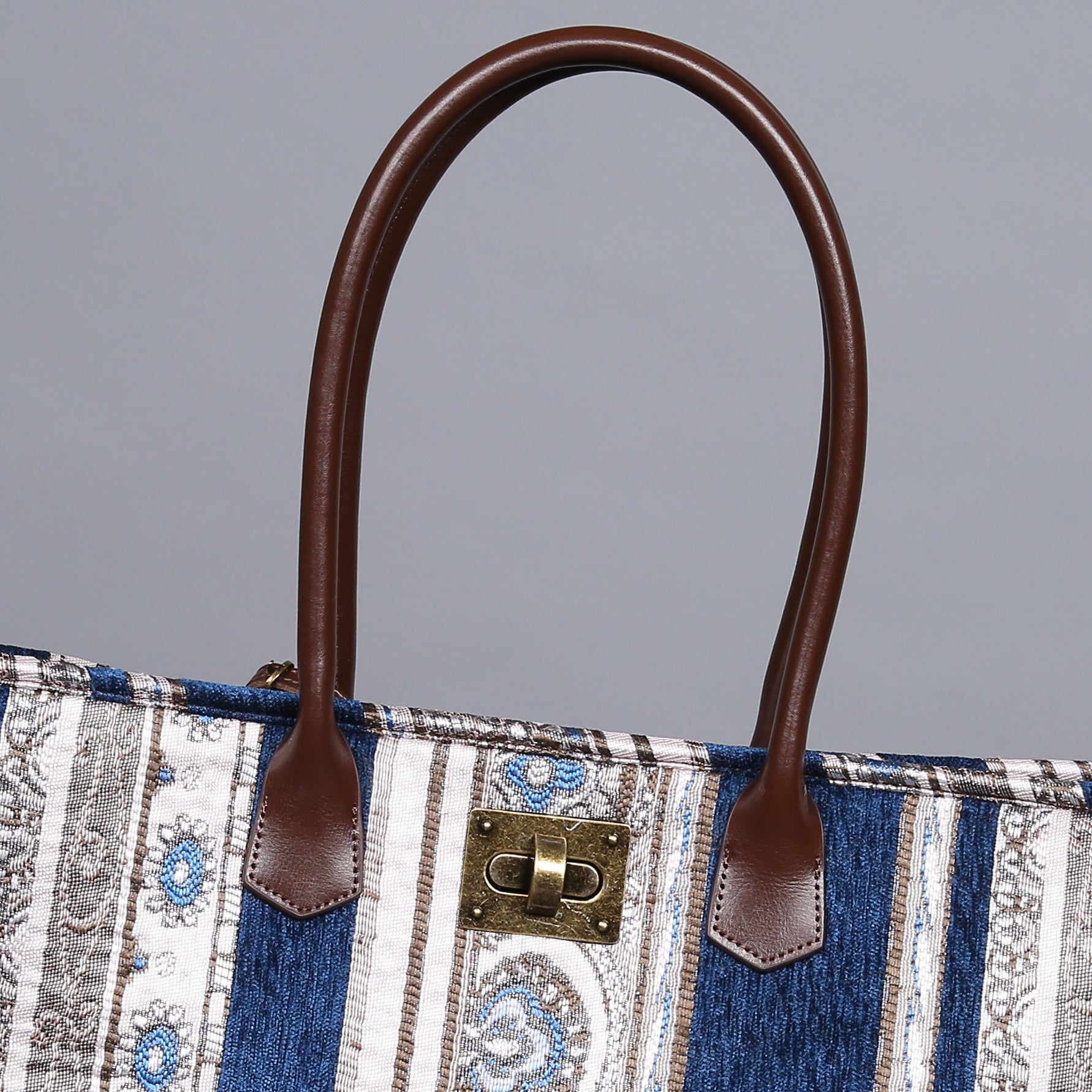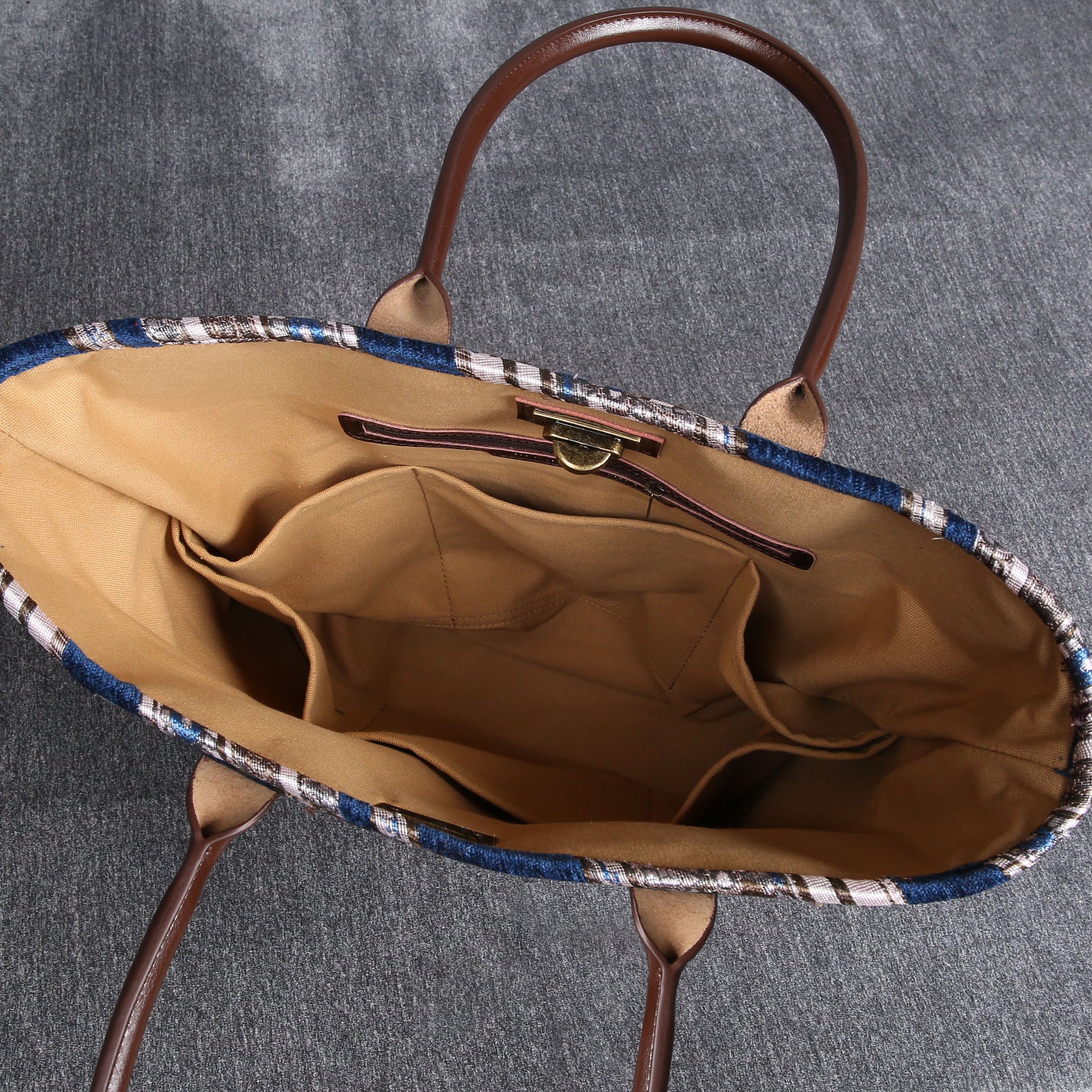 This gorgeous carpet tote bag is of premium quality, the main body is made of thick chenille carpet, it can stand still on its own; The handles and belt are genuine leather, heavy cotton canvas lining, the closure is with high quality vintage twist turn lock.