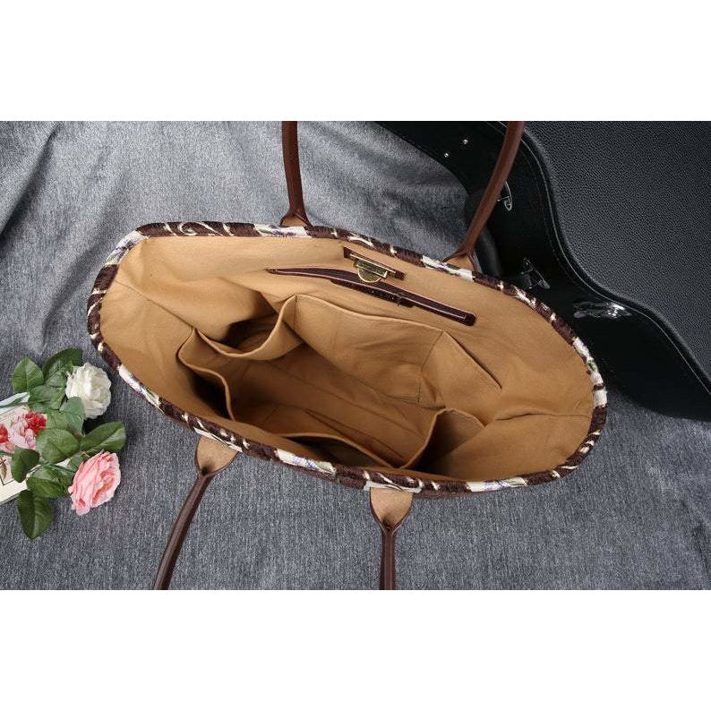 This gorgeous carpet tote bag is of premium quality, the main body is made of thick chenille carpet, it can stand still on its own; The handles and belt are genuine leather, heavy cotton canvas lining, the closure is with high quality vintage twist turn lock.