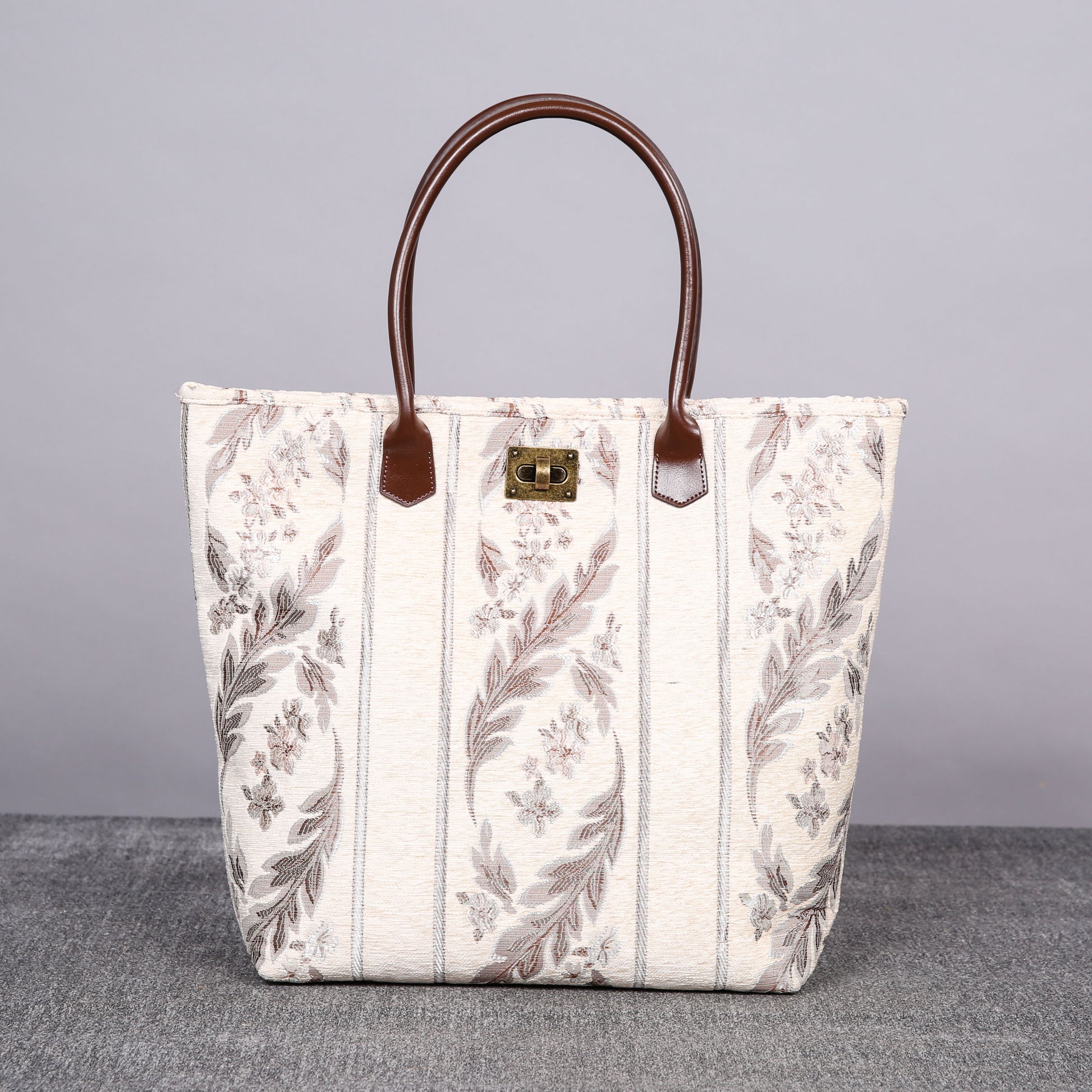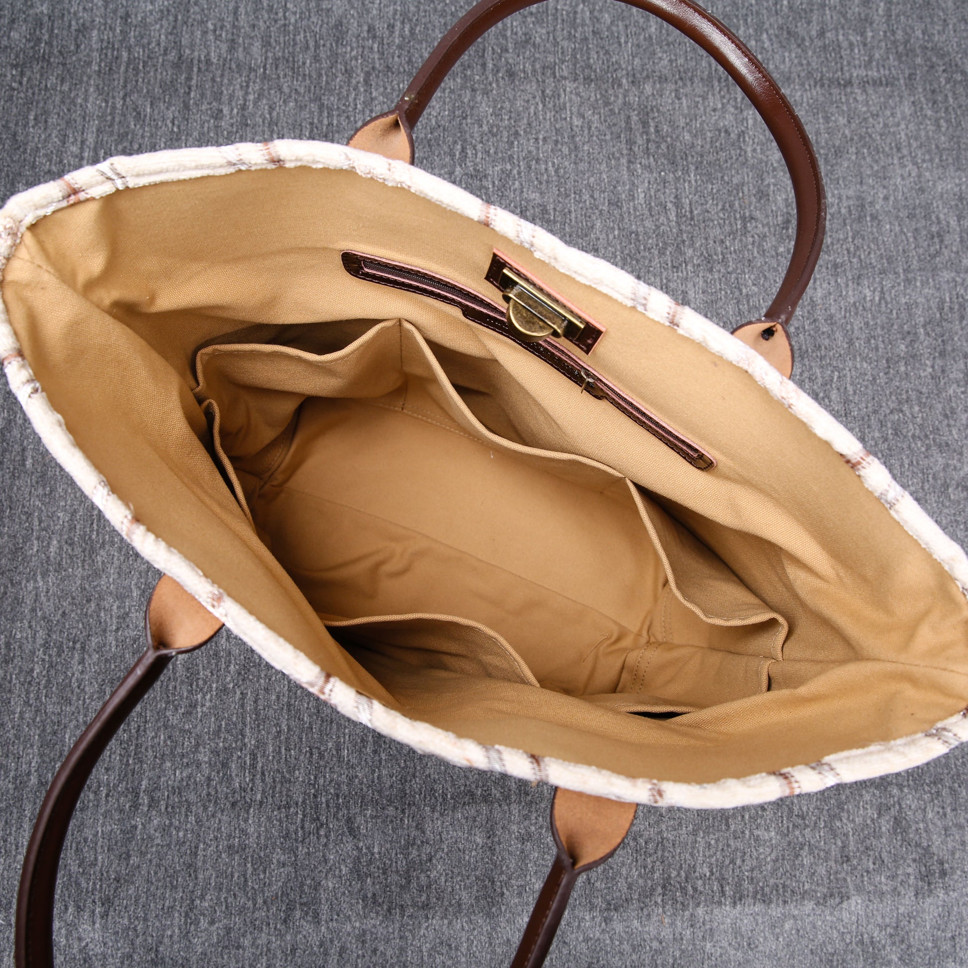 This gorgeous carpet tote bag is of premium quality, the main body is made of thick chenille carpet, it can stand still on its own; The handles and belt are genuine leather, heavy cotton canvas lining, the closure is with high quality vintage twist turn lock.