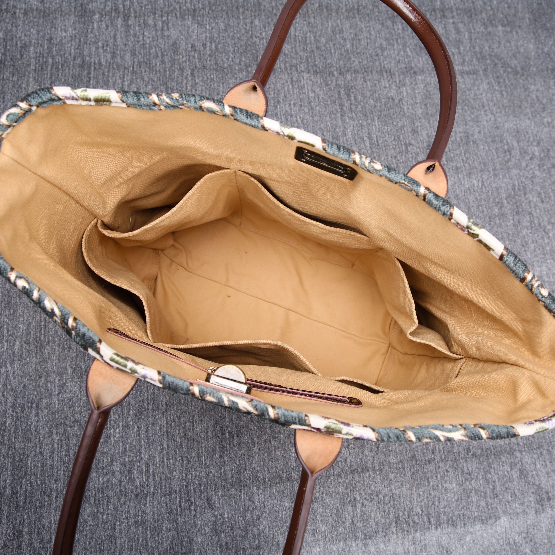 This gorgeous carpet tote bag is of premium quality, the main body is made of thick chenille carpet, it can stand still on its own; The handles and belt are genuine leather, heavy cotton canvas lining, the closure is with high quality vintage twist turn lock.