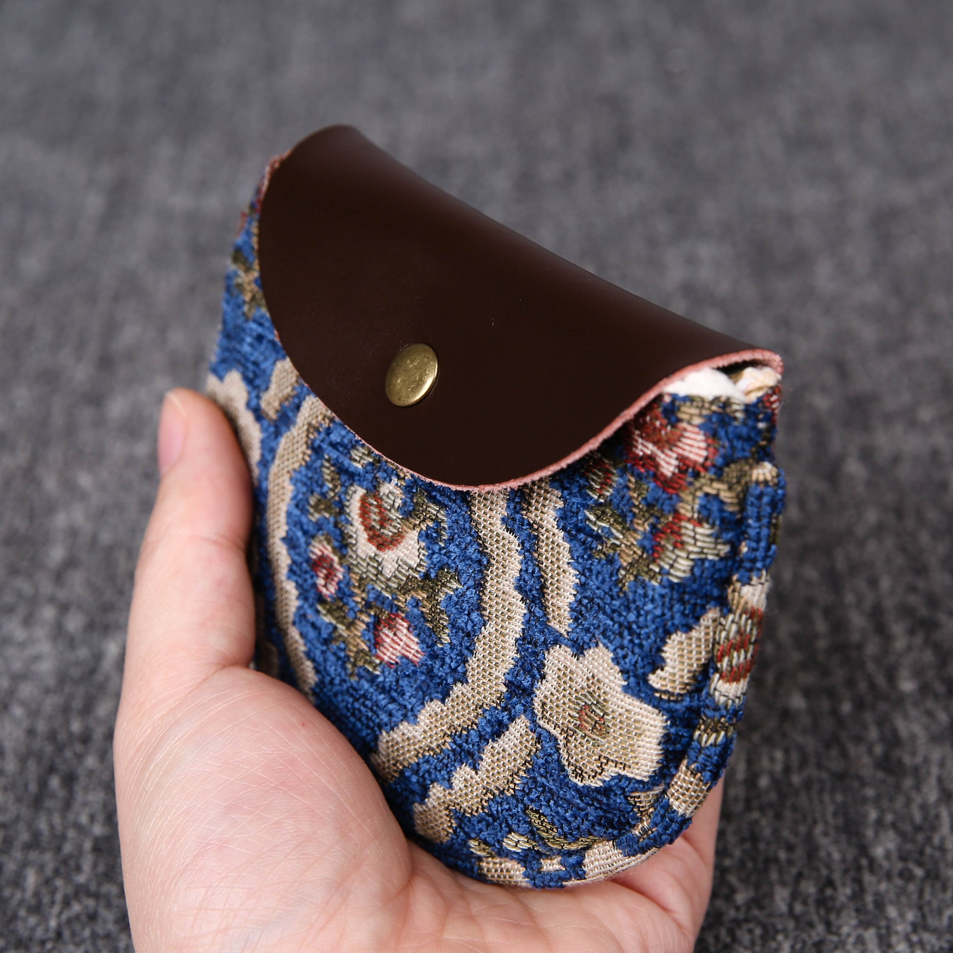 This chic coin purse is made of rich chenille carpet, cotton floral canvas, and brass clasp with double kiss lock.